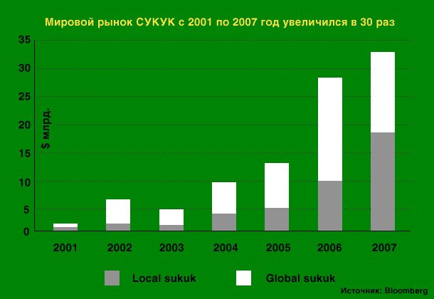 Г.Б.: Исламские ценные бумаги, обеспеченные активами. Эти инструменты предоставляют инвесторам право собственности на базовый актив и предполагают доход. Эмитент должен определить объем активов, продаваемых при помощи сукук, инвесторы делят с эмитентом риски и получают доход пропорционально участию в проекте. Сукук могут входить в листинги и рейтинги, но это не обязательно. В качестве эмитентов могут выступить не только корпорации, но и государства – в зоне Персидского залива крупнейшим игроком на рынке сукук являются Арабские Эмираты, на эту страну приходится около 60% объема эмиссий в регионе. В свою очередь, Малайзия контролирует 95% сукук в Юго-Восточной Азии. Популярность сукук быстро растет, по прогнозам экспертов, в 2010 году объем мирового рынка этих бумаг составит $150 млрд, при этом сектор сукук становится все более сложным, структурированным и диверсифицированным.