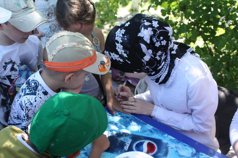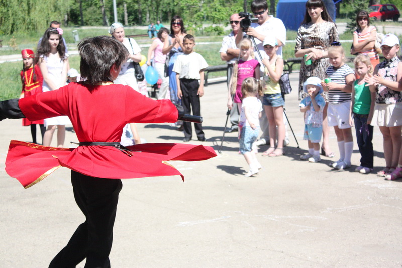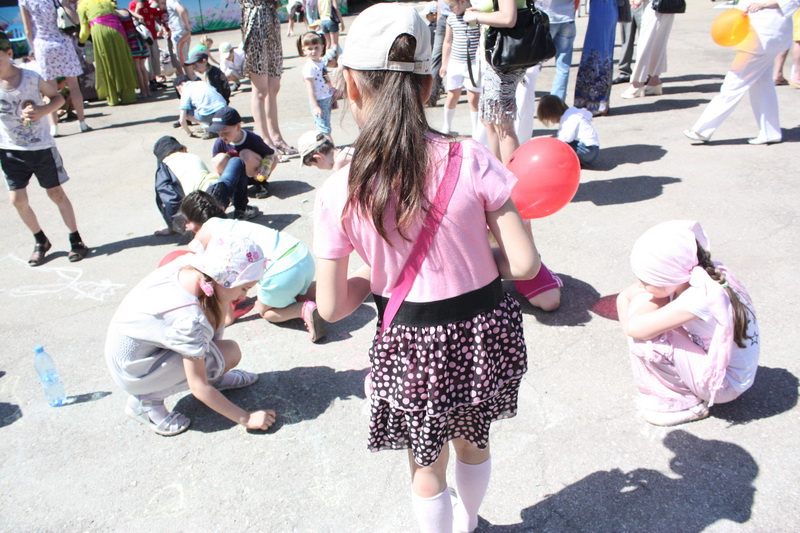 После сказочного спектакля их ждал концерт с танцами, песнями, розыгрышами, подарками. Самым шумным и оживленным оказался конкурс рисунка, в котором дети рисовали на асфальте цветными мелками свою семью, любимых героев, писали фразы отражающие настроение каждого ребенка «Я люблю мир», «Мама, папа я — лучшая семья», «Я люблю своих друзей».