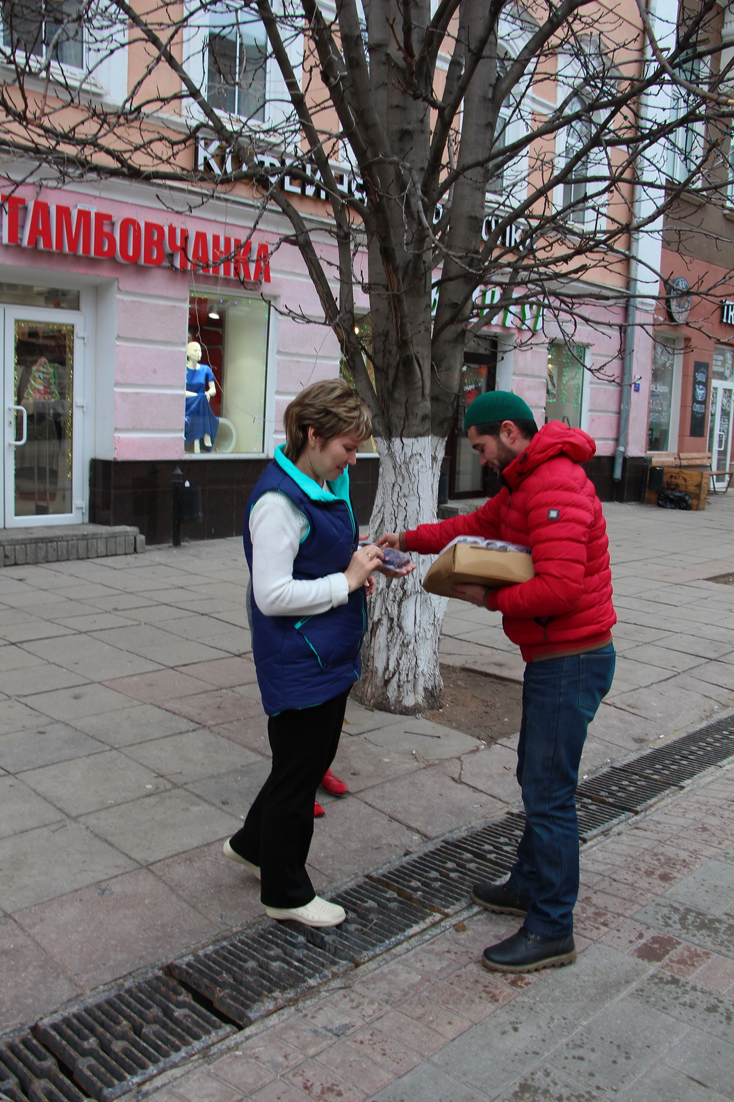 Буквально за полчаса волонтеры раздали горожанам около 400 коробочек с финиками и конфетами. Получившие сладкие подарки приятно удивлялись, ведь многие и не знали, что сейчас завершается месяц, в котором родился последний посланник Аллаха.