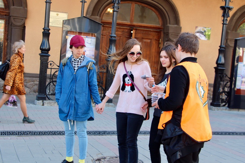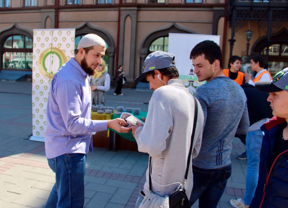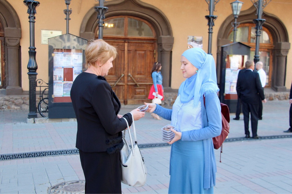 В этот день активисты общественных организаций «Родник» и «Возрождение» раздавали на проспекте Кирова всем прохожим сладкие подарки – красочные коробочки с финиками в честь наступления Священного месяца Поста.