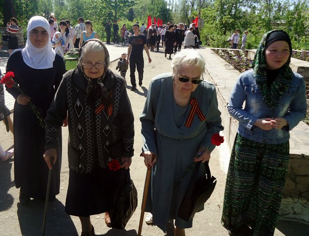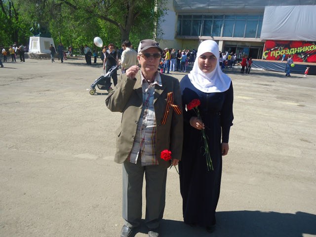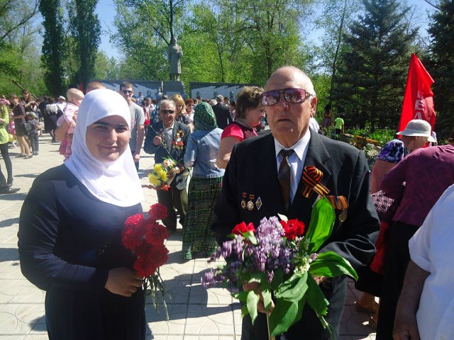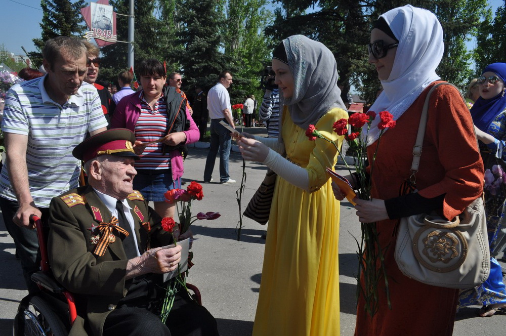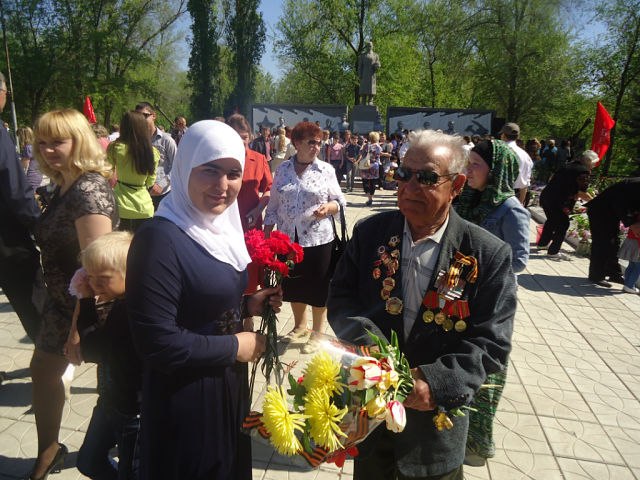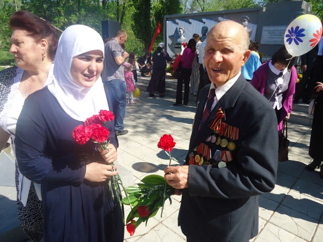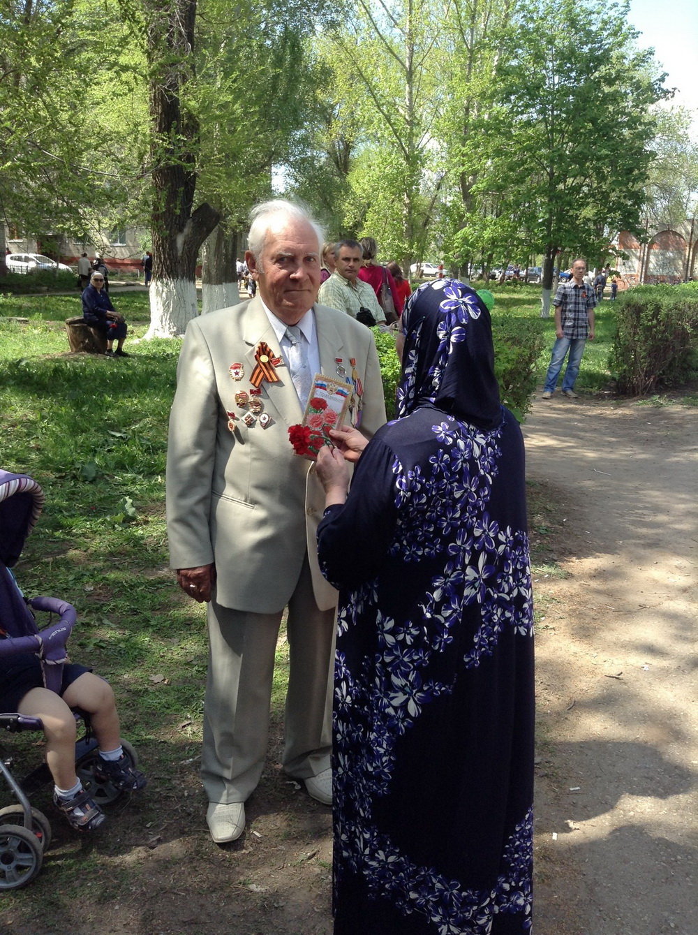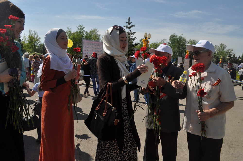 9 мая начинается для девушек из «Родника» ранним утром в мечети, откуда они, собравшись вместе, с цветами и в приподнятом настроении, отправляютсяв Парк Победы поздравлять ветеранов Великой Отечественной войны. Встречая пожилых людей в парадной одежде с орденами и медалями, девушки в хиджабах вручают им гвоздики и открытки со словами благодарности.
