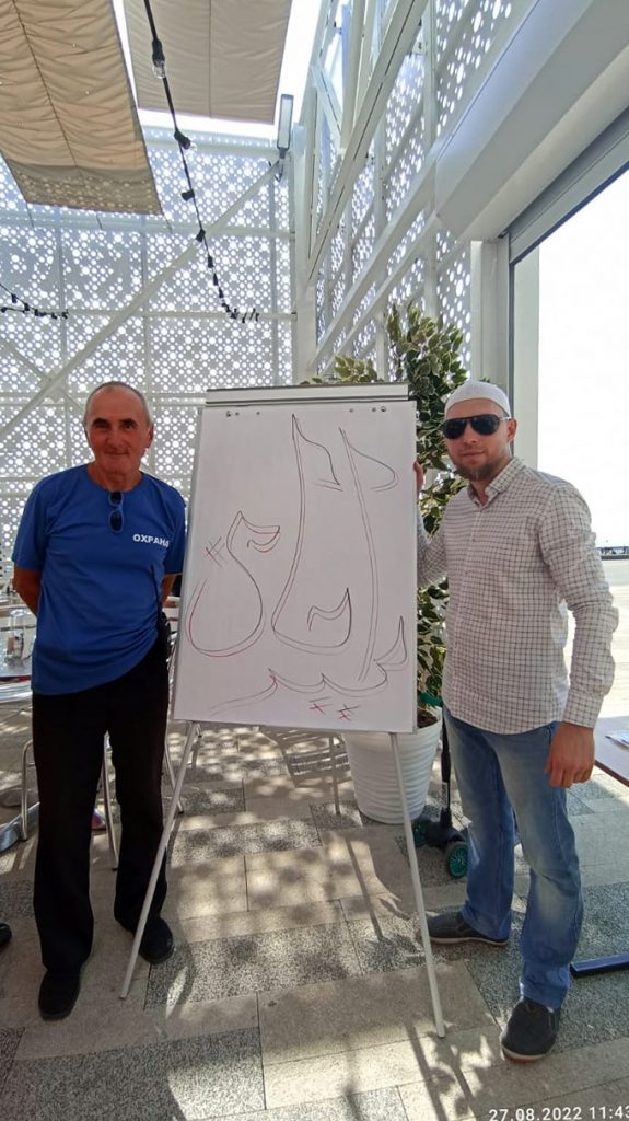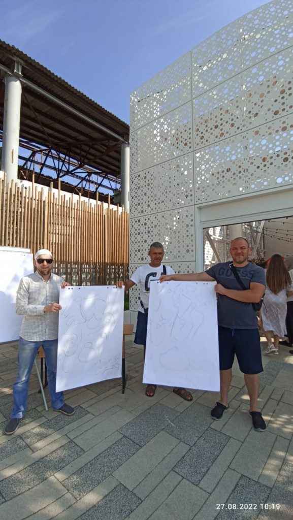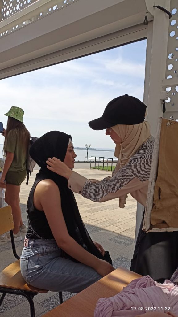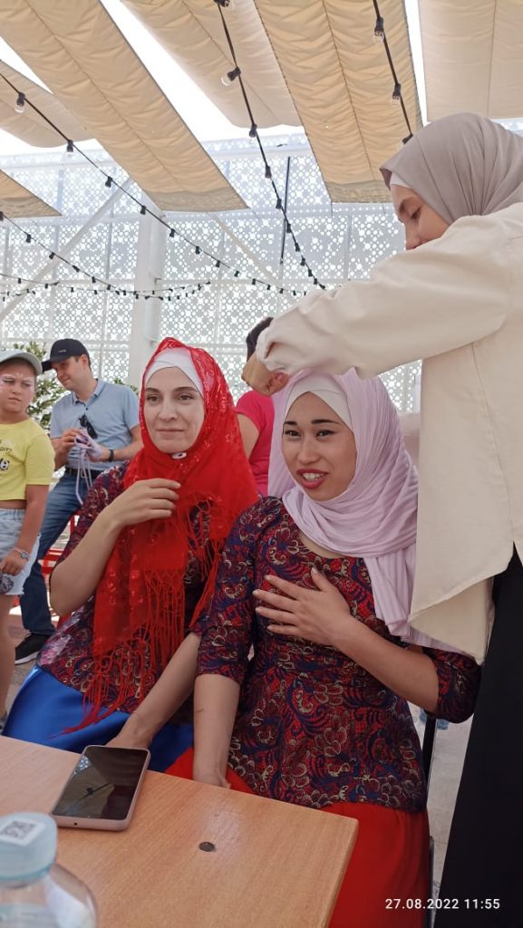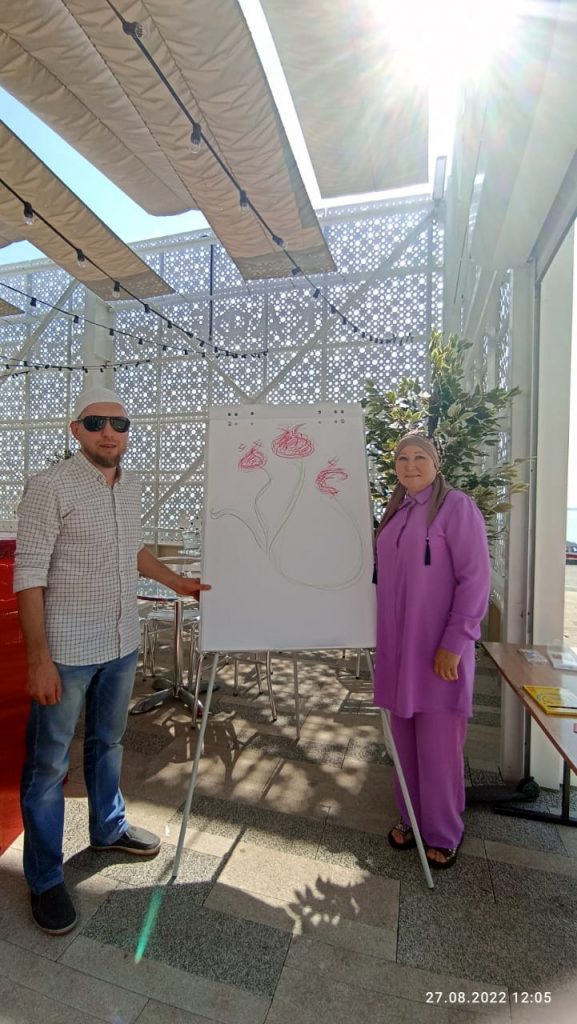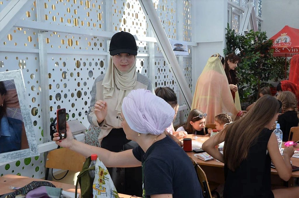 В этот день была организована работа нескольких творческих площадок. Активисты региональной культурно-просветительской организации «Возрождение» провели мастер-классы по каллиграфии и повязыванию платка.