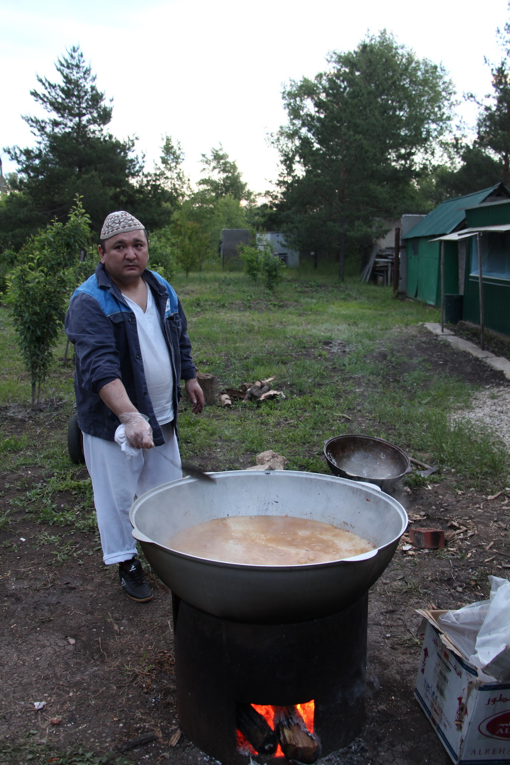 Пока в большом казане готовилась пища, волонтеры накрывали дастархан. В это время из уст хафизов звучали аяты Священного Корана. За мгновения перед разговлением постящиеся просили Творца о прощении грехов, принятии уразы и других видов поклонения.