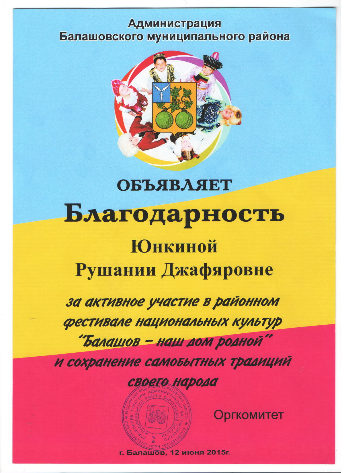 В завершении мероприятия от имени администрации муниципального района за активное участие в фестивале национальных культур «Балашов – наш дом родной!» была объявлена благодарность руководителю «Родничка» Рушании Юнкиной.