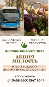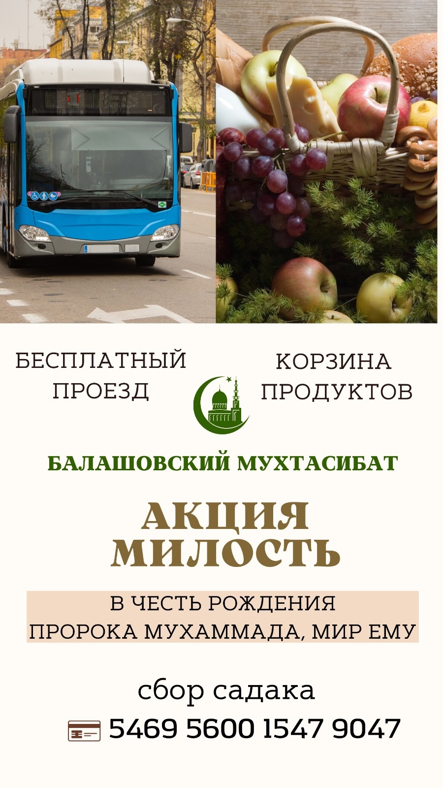 «С наступлением месяца Рабиуль-Авваль мы вновь запускаем акцию «Милость», посвященную состраданию, милости и щедрости нашего пророка Мухаммада (мир ему) ко всем творениям. Так и мы, следуя его Сунне, открываем сбор на продуктовые корзины и бесплатный проезд на автобусе», — отметил имам-мухтасиб Балашовского района Ильяс-хазрат Юнкин.