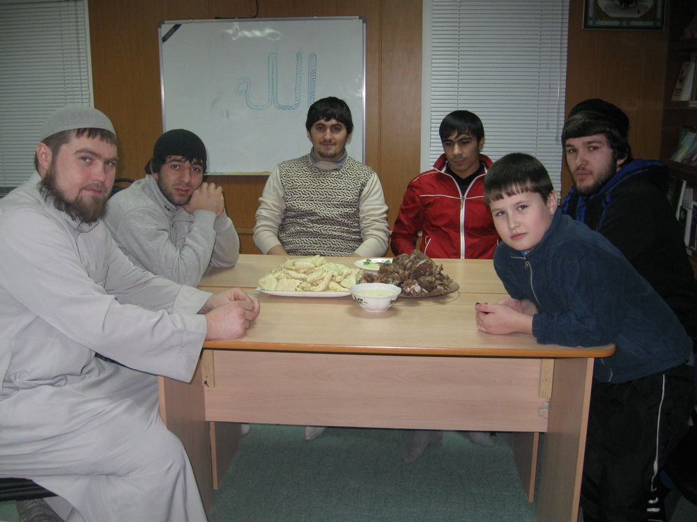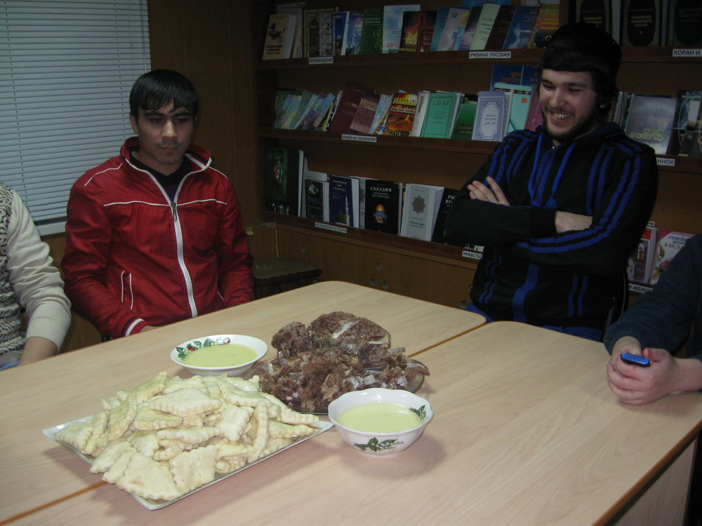 Сегодня вечером в классе вольской мечети прошло мероприятие под названием… Нет, сегодня прошло чаепитие, приуроченное к… А что у нас, собственно, прошло? Да ничего, просто один брат приехал в мечеть и сказал, что хочет принести в жертву барашка, а мясо предложил раздать, кому посчитаем нужным. Ну, мы и посчитали нужным использовать мясо на то, чтобы по вечерам готовить вкусные блюда для посиделок без повода и без громких названий. Приглашения выглядели примерно так: