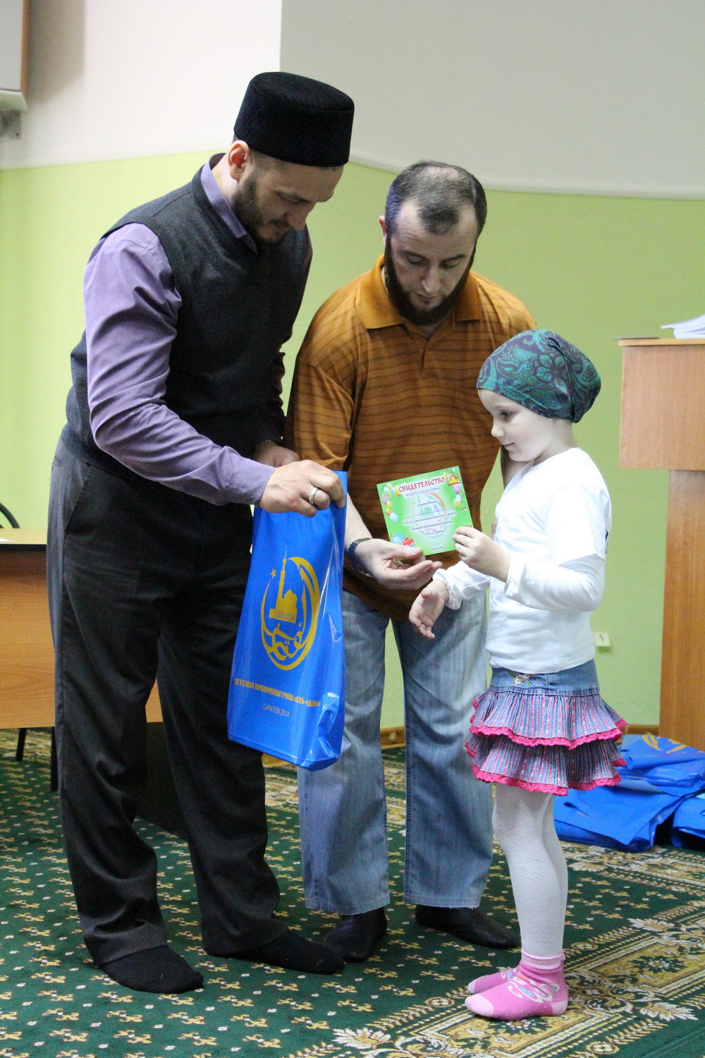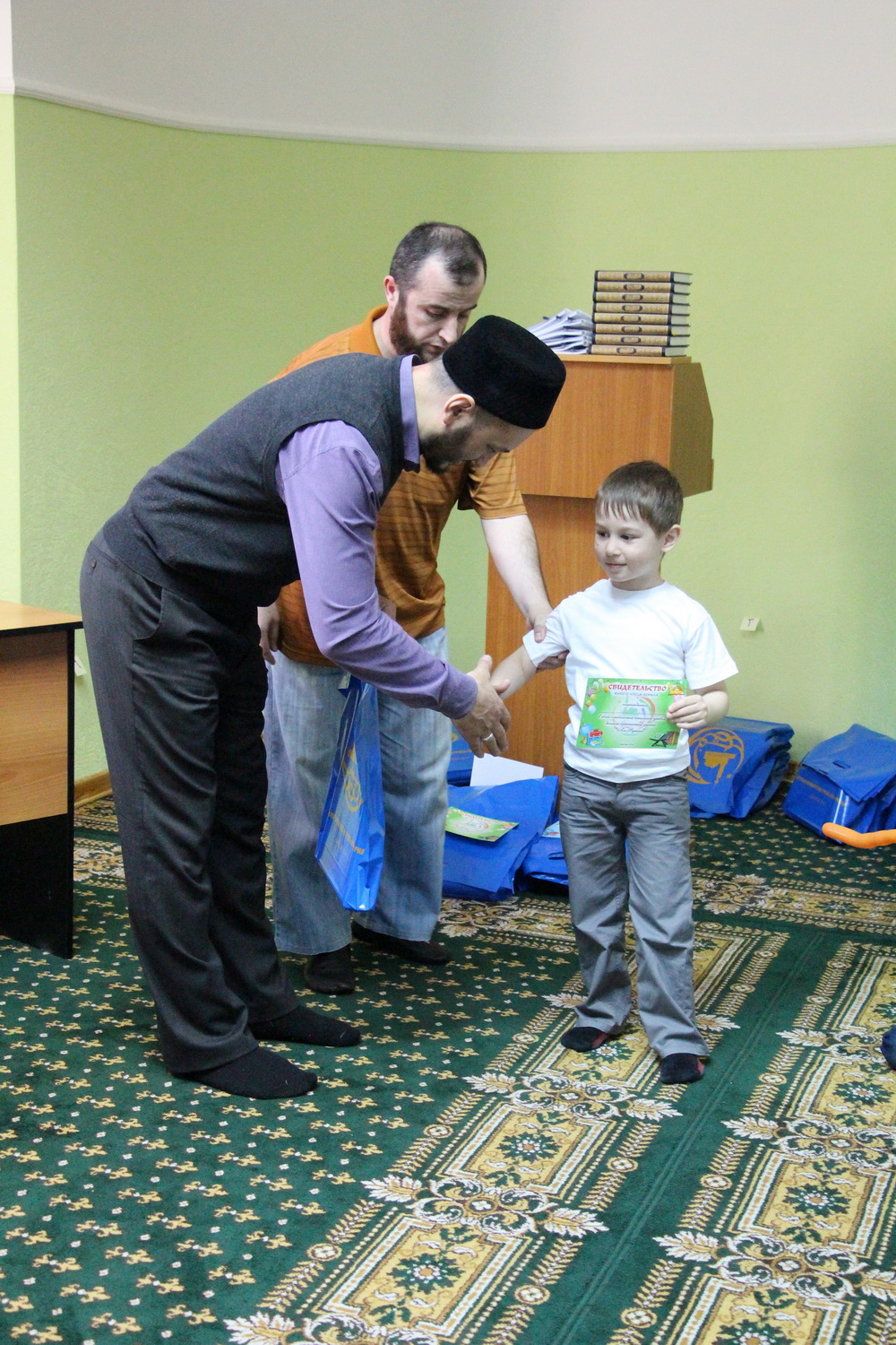 После этого началось награждение ребят из 5 и 6 группы (дети от 3 до 4 лет) грамотами юного чтеца Корана. Мальчикам и девочкам чуть постарше (1 — 4 группы) вручили свидетельства об окончании начального уровня детской коранической группы «Аль-Фуркан». Помимо этого каждый ребенок получил красочное лото для изучения различных языков.