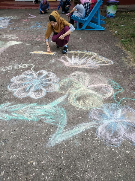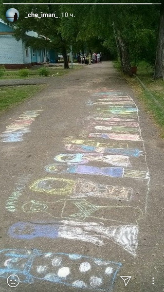 Особый интерес у них вызвал конкурс рисунков на свободную тему. Отдыхающие расписали цветными мелками асфальт на территории лагеря.