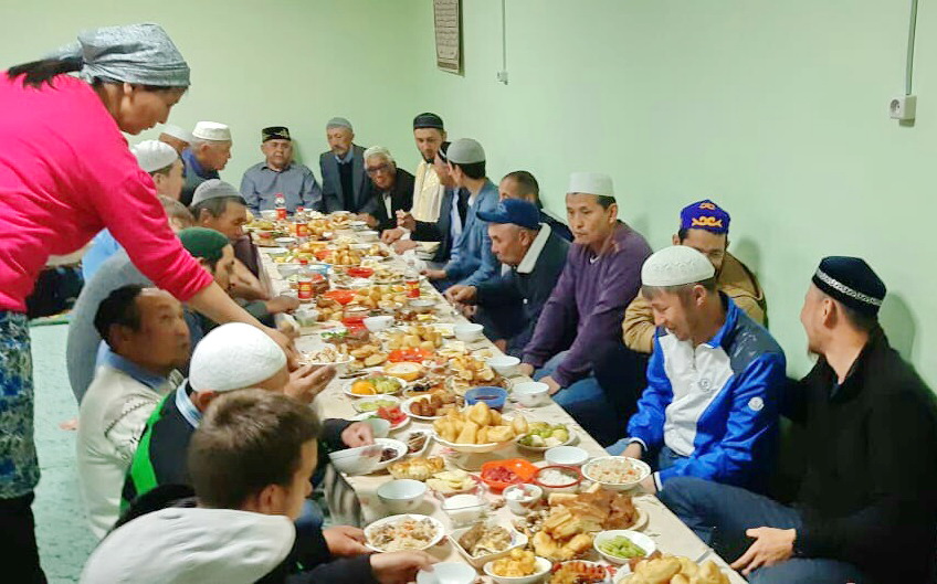 В питерской мечети постящиеся совершили Магриб-намаз, а после заняли свои места за праздничным дастарханом.