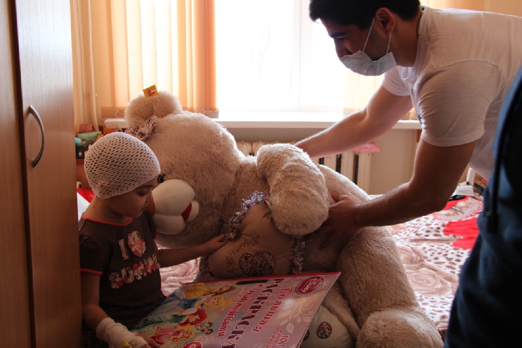 Общими усилиями для Салимы был подготовлен подарок: двухметровый медведь, которого девочка прозвала Розой, и ее любимые раскраски.