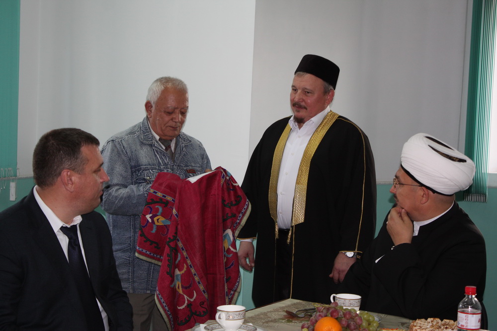 Заслуги юбиляра также отметили почетные гости, которые пришли на торжественное мероприятие не с пустыми руками. Особым подарком в праздничный день стал молитвенный коврик, преподнесенный представителем узбекской диаспоры. Он подчеркнул, что возраст яркого намазлыка составляет 110 лет.