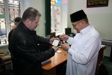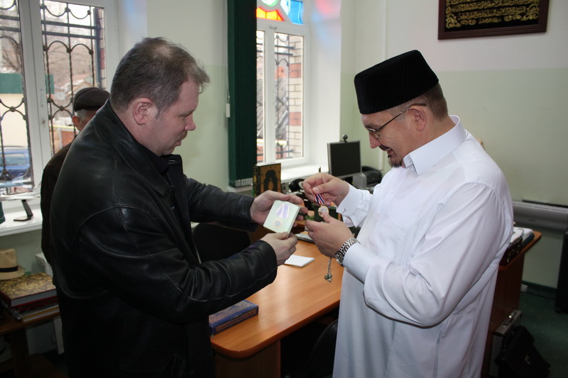 От имени федерации вручить награду пришли исполнительный директор Виктор Тарасюк и заслуженный работник физической культуры, тренер СК «Барс» Раис Фаткуллин, которые поблагодарив муфтия, пригласили его на очередной городской турнир по боксу.