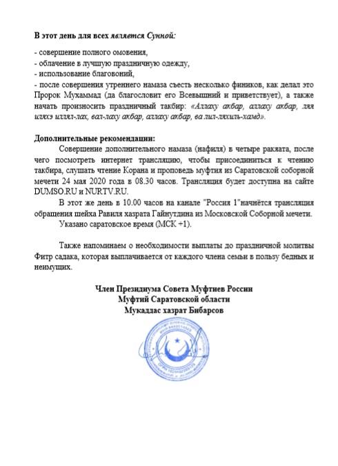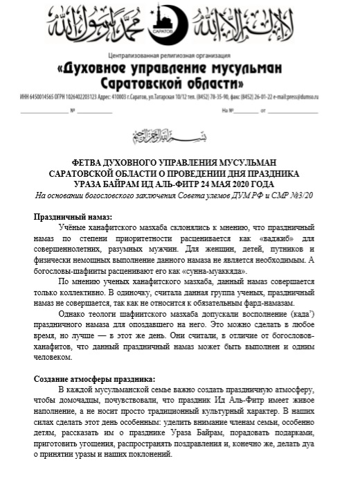 ФЕТВА ДУХОВНОГО УПРАВЛЕНИЯ МУСУЛЬМАН САРАТОВСКОЙ ОБЛАСТИ О ПРОВЕДЕНИИ ДНЯ ПРАЗДНИКА УРАЗА БАЙРАМ ИД АЛЬ-ФИТР 24 МАЯ 2020 ГОДА