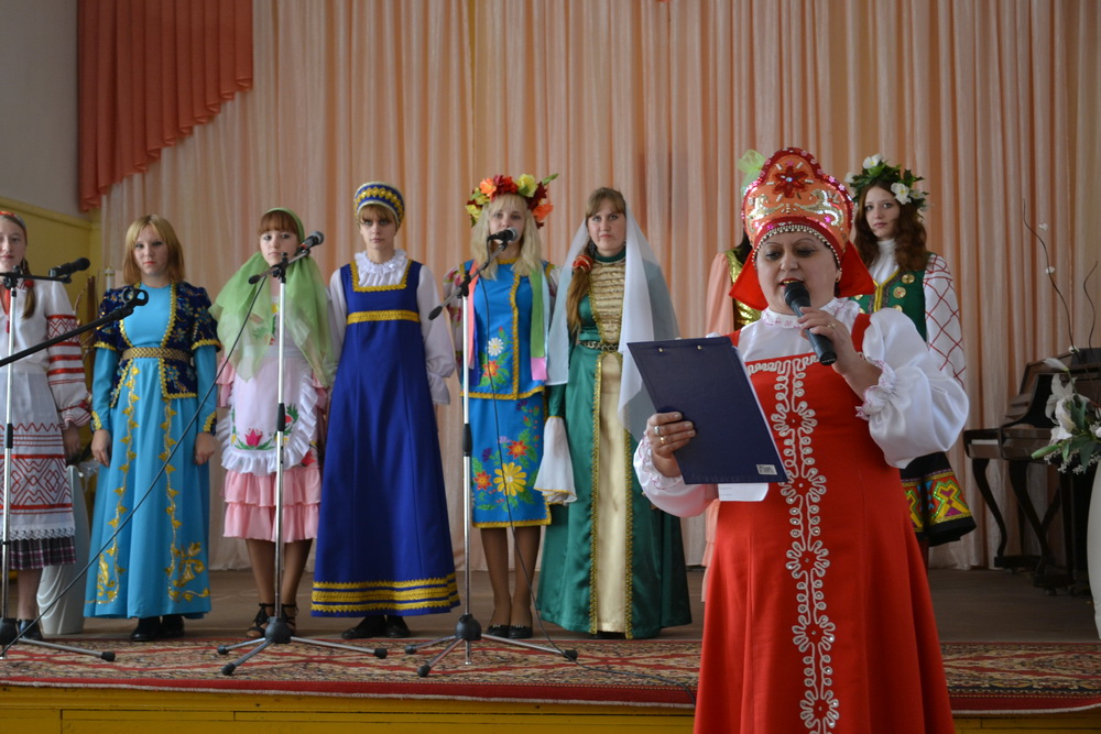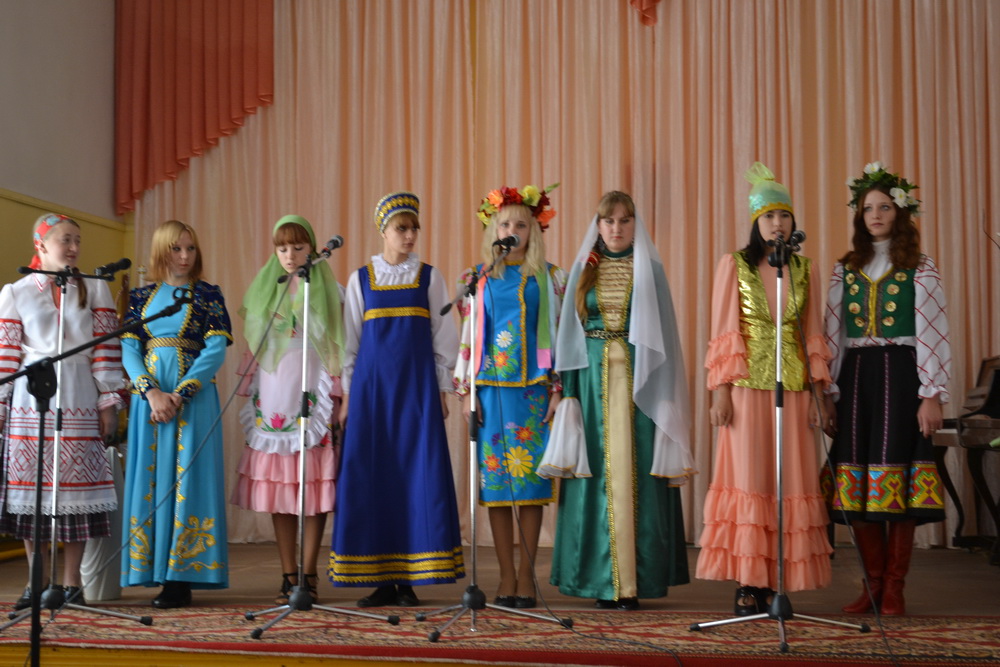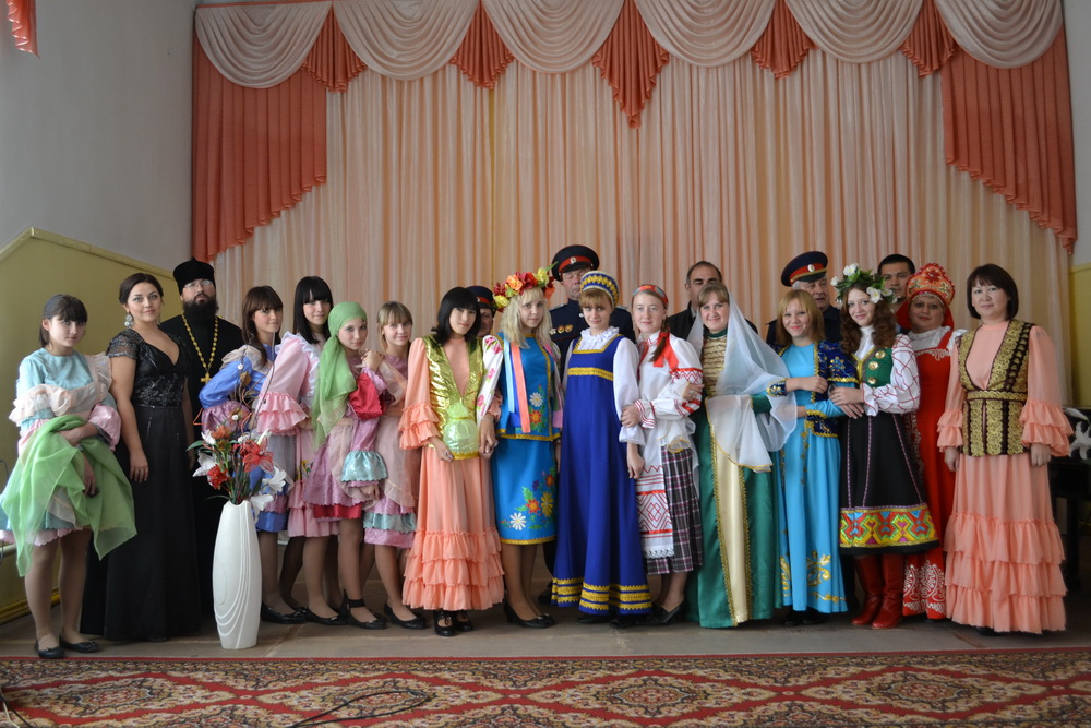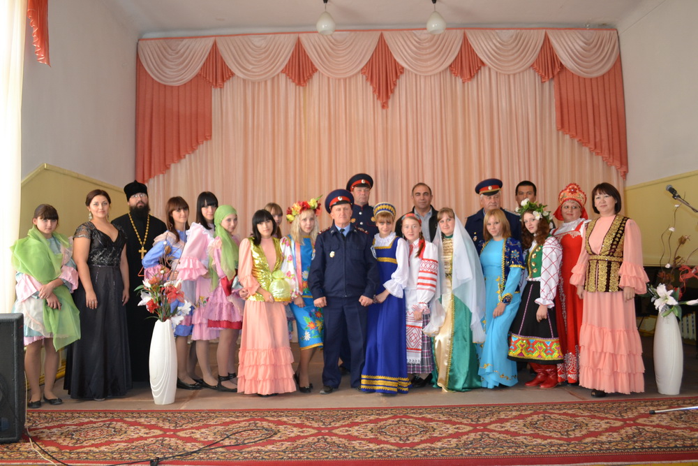 Начался концерт с красочного выхода выступающих в русском, украинском, белорусском, казахском, молдавском и татарском национальных костюмах.