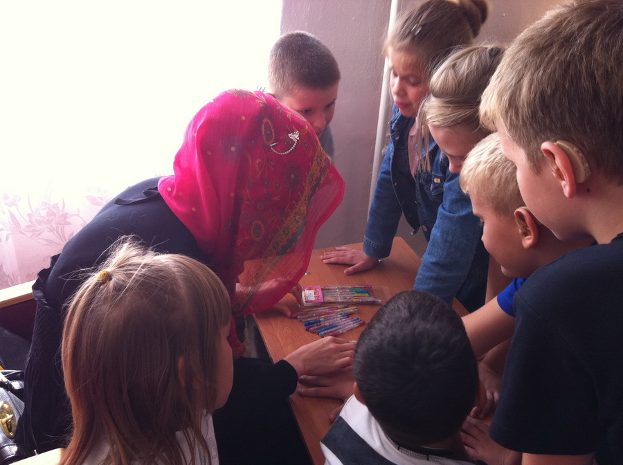 Гости из женской организации с помощью сурдопереводчика поздоровались с ребятами мусульманским приветствием «Ассаламу Алейкум!», объяснив, что это значит «Мир вам!», рассказали малышам, что все книги, раскраски, мягкие игрушки, альбомы и многое другое им передали такие же дети, как и они.