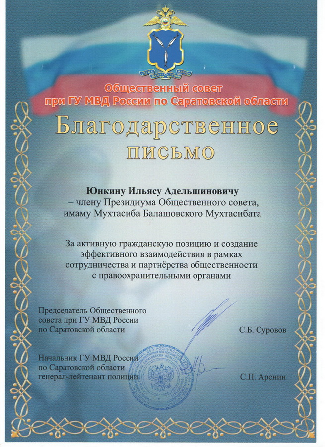 В городе Балашове Саратовской области состоялось расширенное заседание Общественного совета при УВД муниципального района, в котором приняли участие член президиума ОС, имам-мухтасиб Ильяс-хазрат Юнкин, председатель Общественного совета при МВД по Саратовской области Сергей Суровов и начальник областного МВД Сергей Аренин.