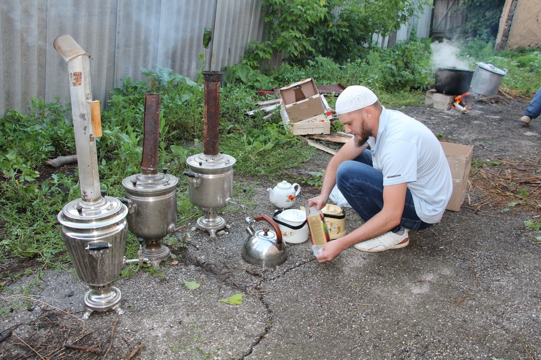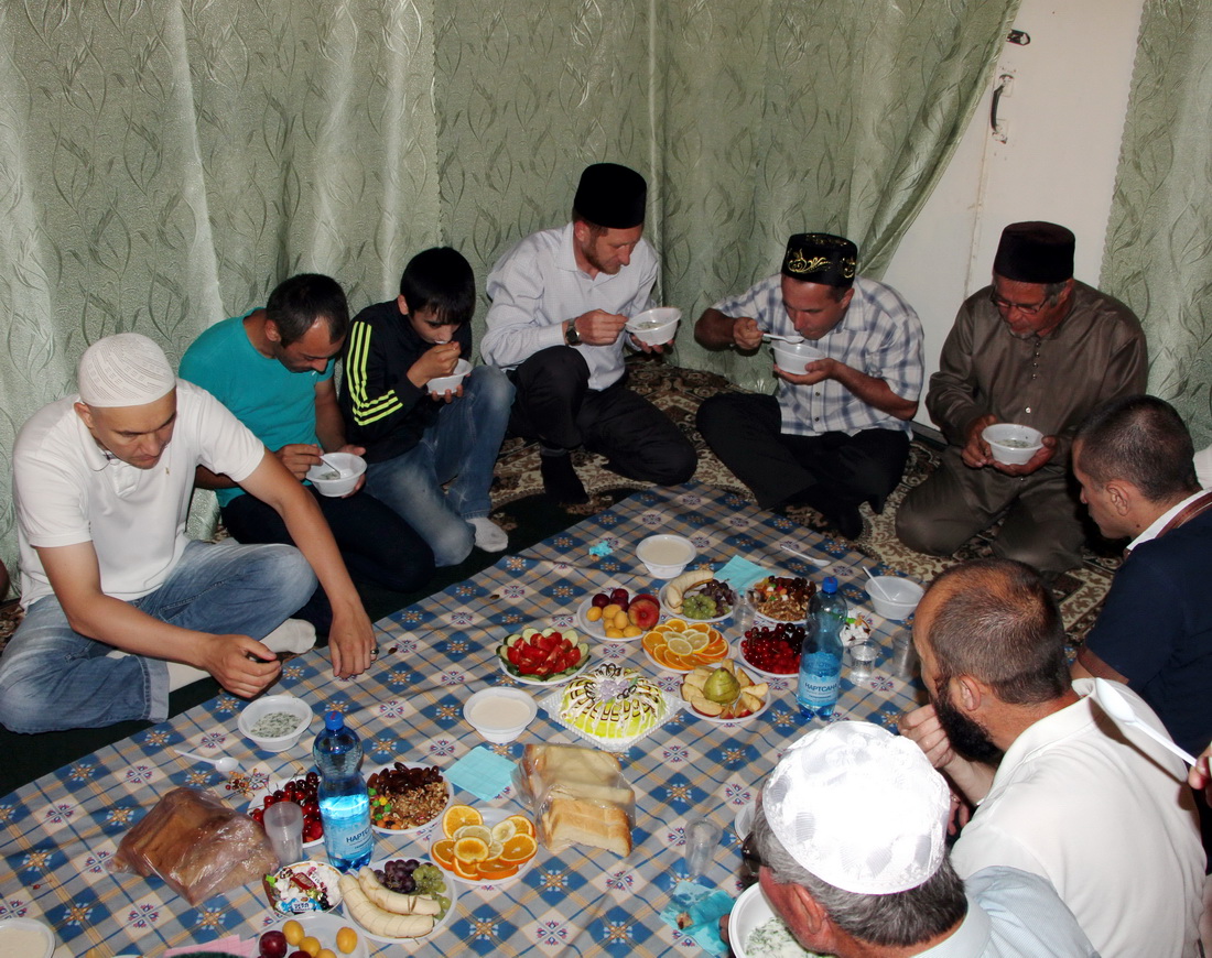 Прозвучал азан, и постящиеся совершили вечернюю молитву. После этого всех пригласили за дастархан с традиционными блюдами мусульманских народов. Также каждый смог отведать свежие фрукты и ягоды, сладости и национальную выпечку, выпить чай с травами из самовара.