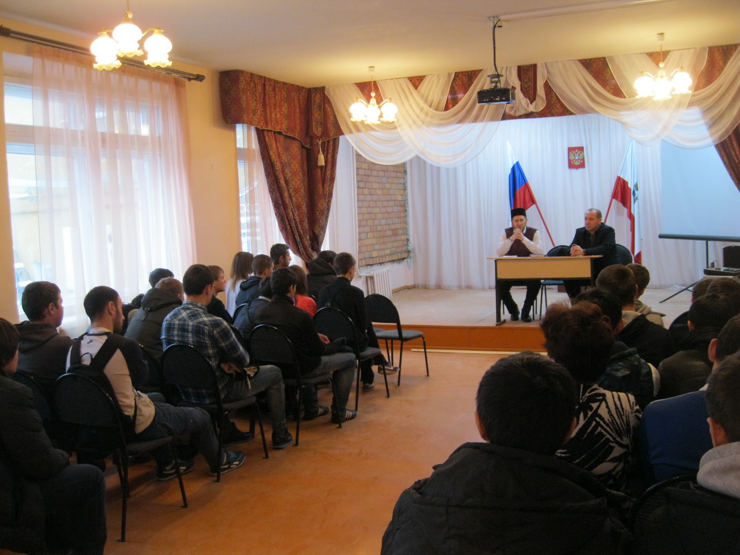 3 декабря имам-хатыб Соборной мечети г.Саратова Фаниль-хазрат Бибарсов провел встречу с первокурсниками строительного лицея (бывшее ПУ №22). Визит мусульманского религиозного деятеля состоялся по приглашению директора образовательного учреждения Василия Абеляшева.