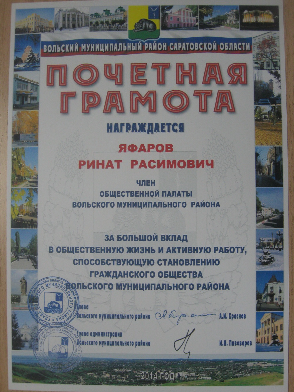 В завершение заседания ряд членов ОП были награждены Почетными грамотами. Абдулхакиму Яфарову вручили грамоту «За большой вклад в общественную жизнь и активную работу, способствующую становлению гражданского общества Вольского муниципального района» от имени главы района Анатолия Краснова и главы администрации района Игоря Пивоварова.