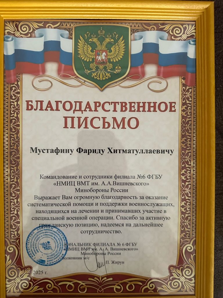Почетный документ в адрес имама подписан начальником филиала медучреждения, полковником Петром Жируном. В нем командование и сотрудники госпиталя благодарят Фарида-хазрата Мустафина за оказание систематической помощи и поддержки пациентов, принимавших участие в спецоперации, и выражают надежду на дальнейшее сотрудничество.