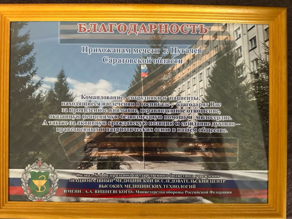 Имам и мусульмане города Пугачева получили благодарственные письма от вольского филиала Военного клинического госпиталя имени А. А. Вишневского Министерства обороны РФ. Об этом сегодня, 25 апреля 2025 года, было объявлено перед Джума в местной мечети.
