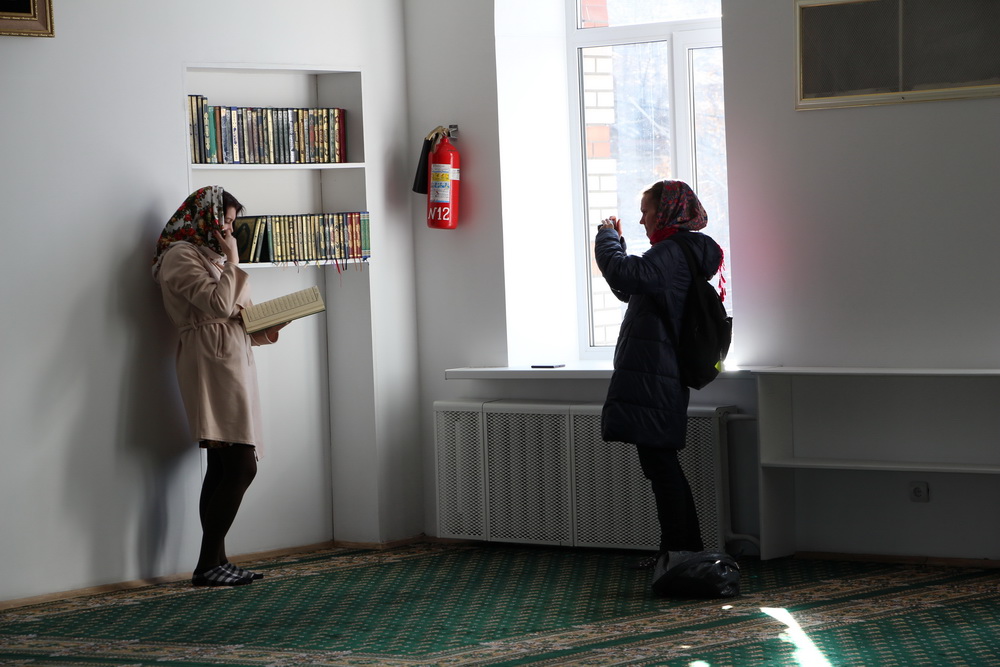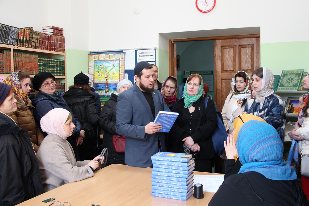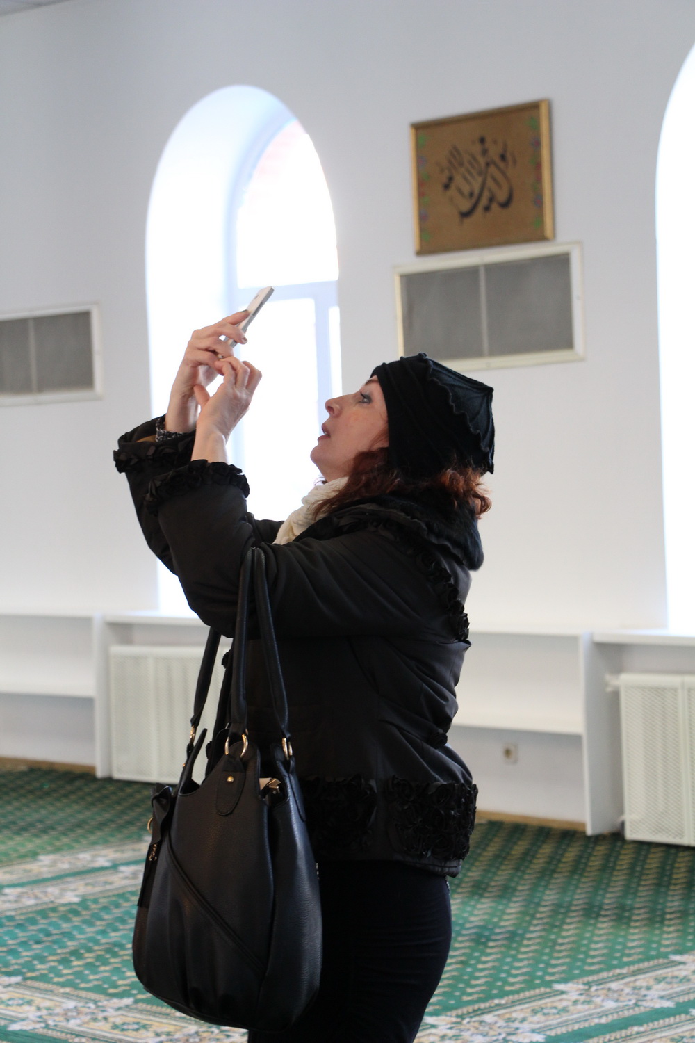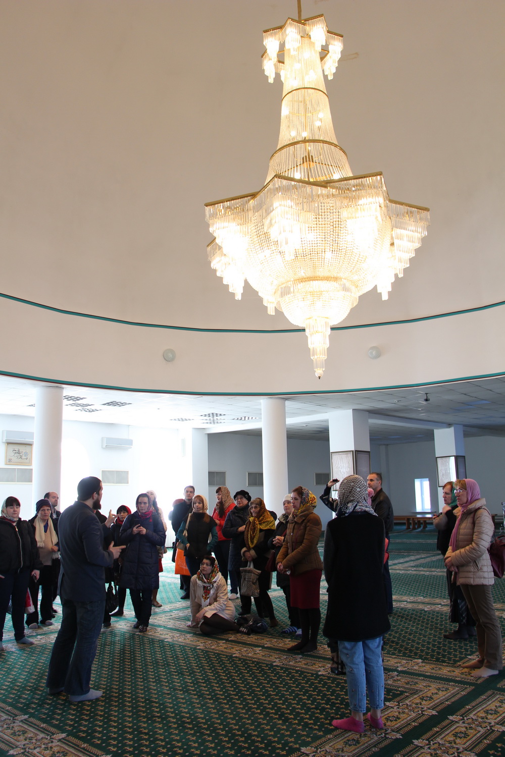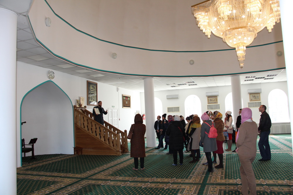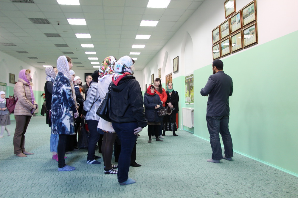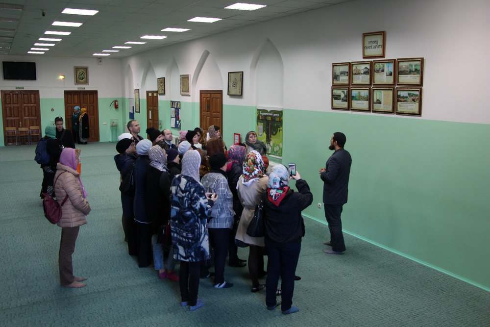 После этого гости побывали в мужском молельном зале, где узнали про особенности его убранства (купол, михраб, минбар и др.). Рустам-хаджи рассказал, сколько раз в день мусульмане совершают намаз и почему выполняют его лицом в сторону Каабы. Как постятся в Рамадан и когда совершается Хадж – обо всем этом и многом другом горожане также узнали в ходе экскурсии.