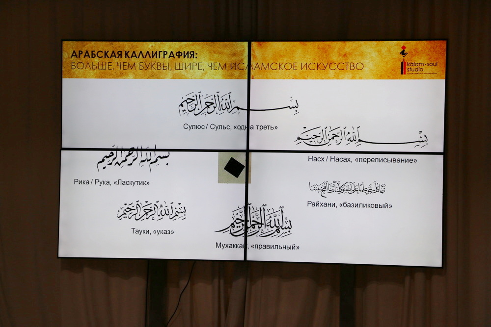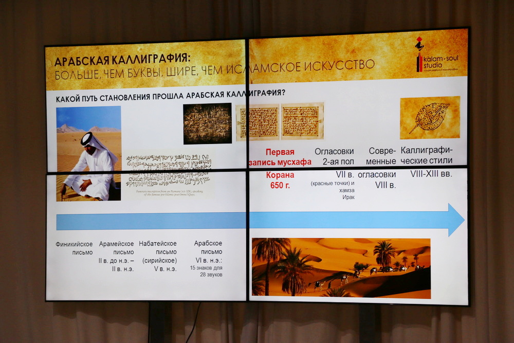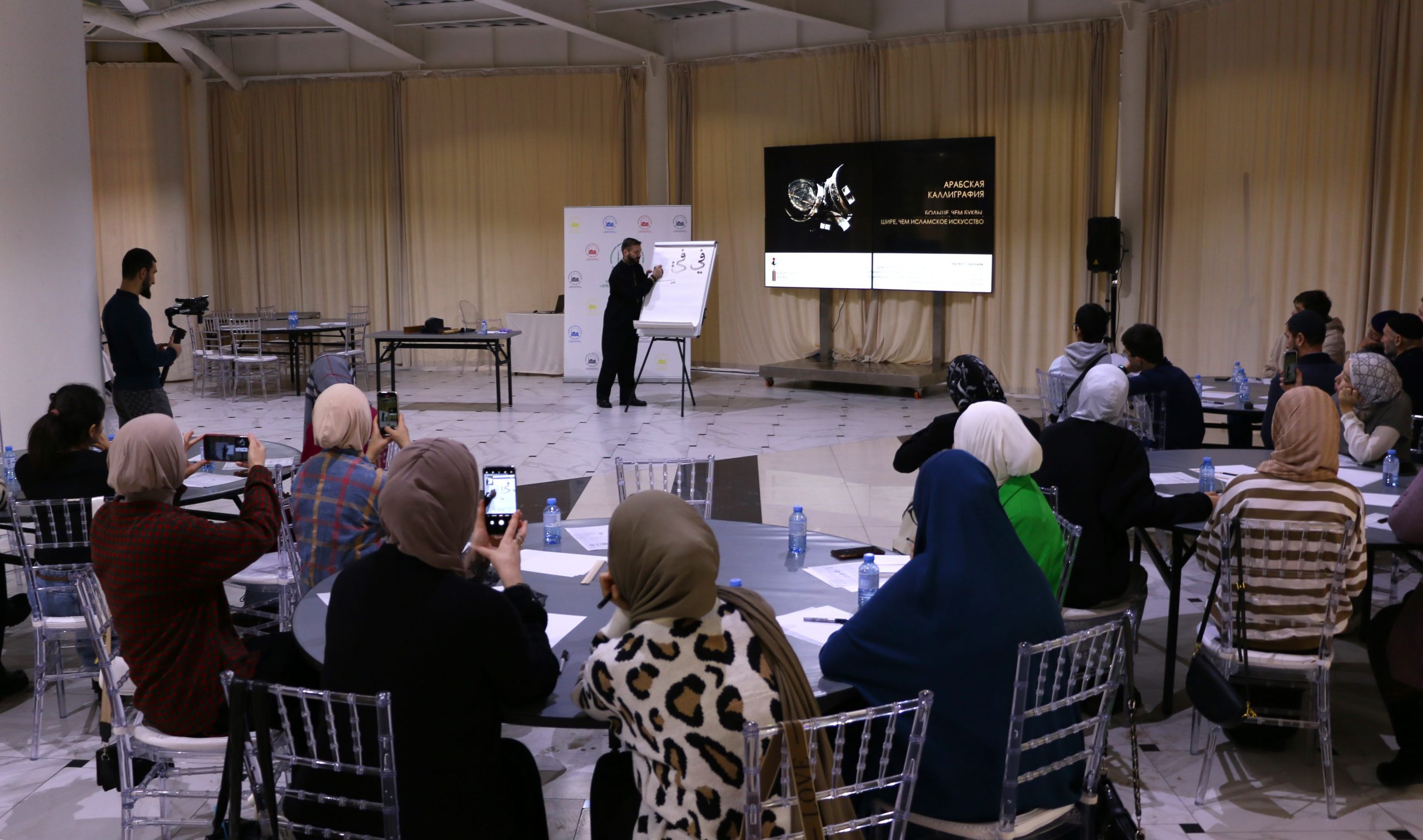 Собравшиеся узнали об истории арабской каллиграфии, которая берет свое начало со времен пророка Мухаммада (мир ему), как она развивалась со временем, какие стили каллиграфии распространены в мире и их особенности. В ходе лекции Сергей Сорочьев рассказал о применении арабской каллиграфии в украшении известных мечетей, росте интереса к каллиграфии в современном дизайне и оформлении зданий и пространств в мире.