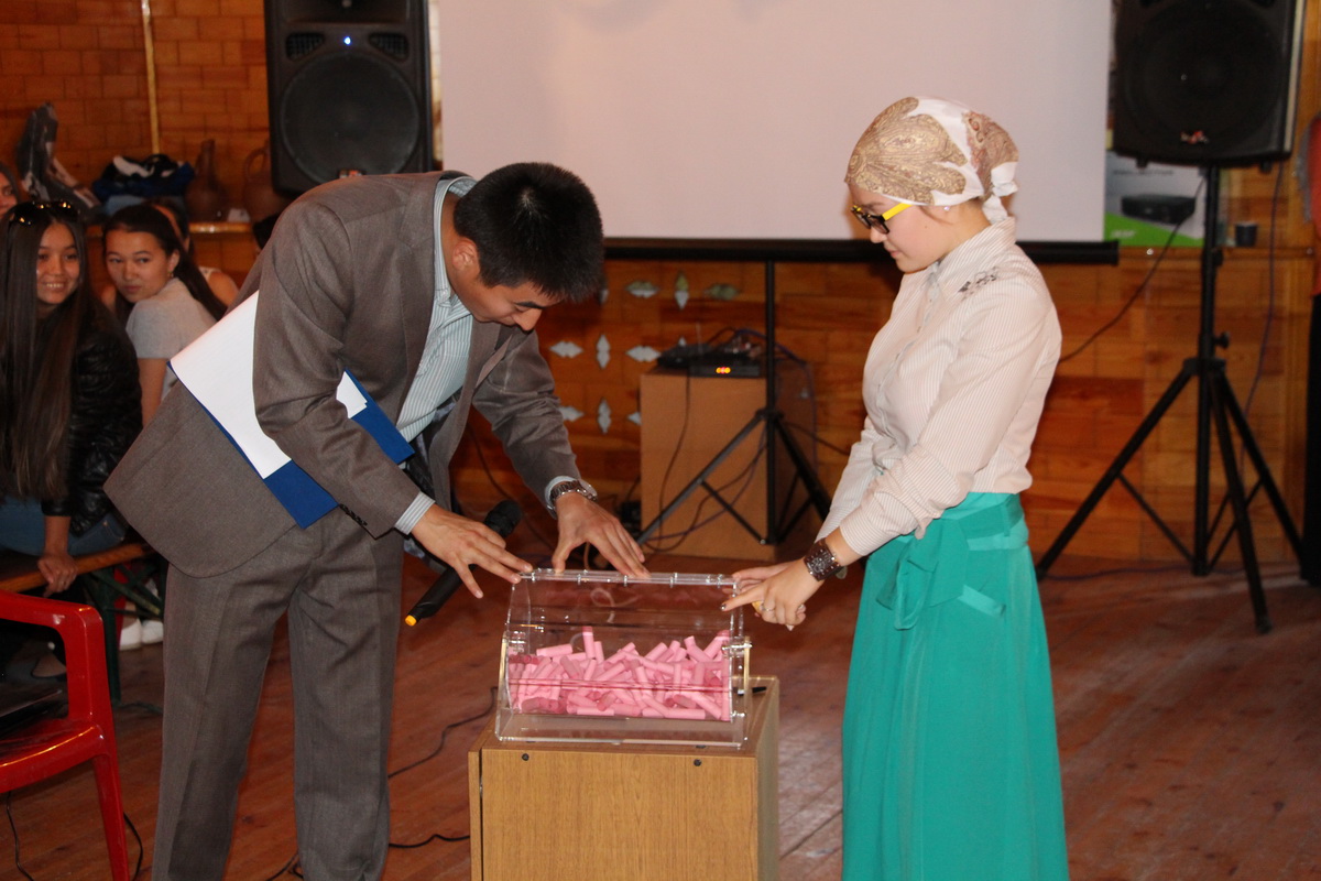 Далее наступил самый интересный момент вечера – розыгрыш лотереи. Раскрутив барабан, ведущие вытаскивали из него номер выигравшего билета. Всего было разыграно три приза – две книги и сертификат на единовременное посещение ресторана «Астана» на сумму две тысячи рублей.