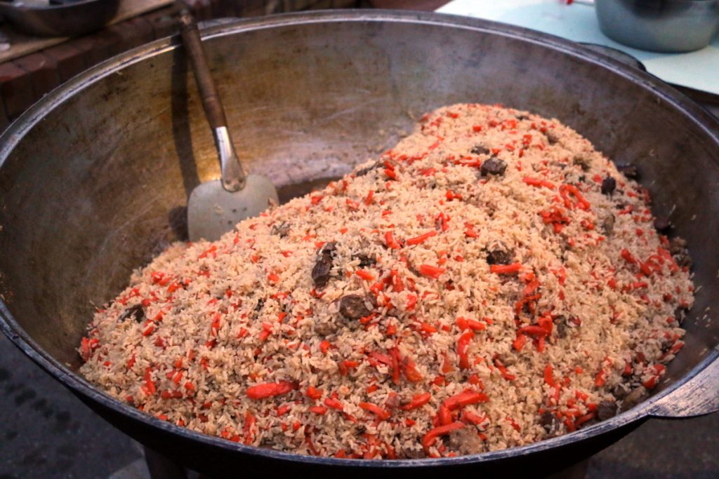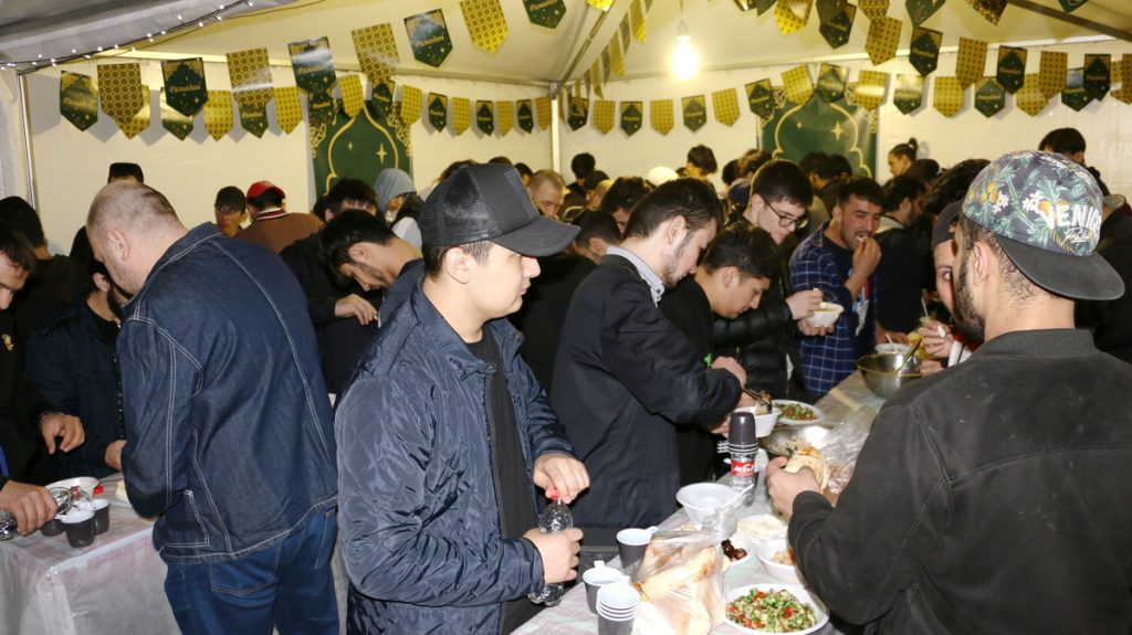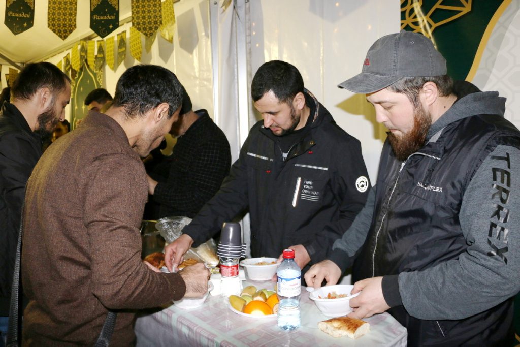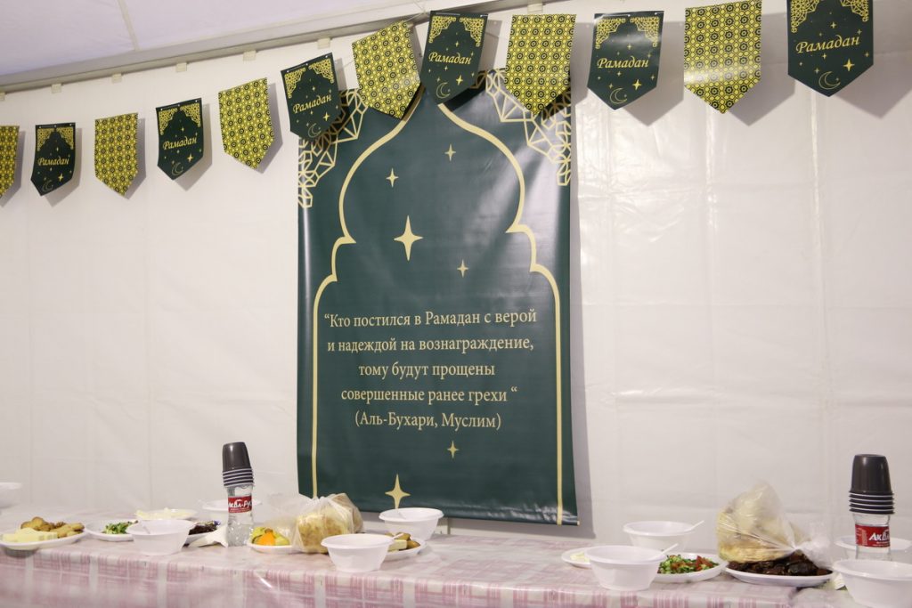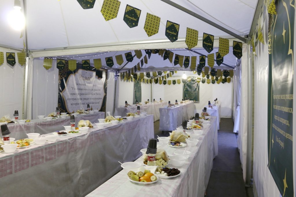 После выполнения коллективного намаза постящиеся направляются в шатер, где их ждут накрытые столы с приготовленными горячими блюдами, овощами и фруктами, сладостями.