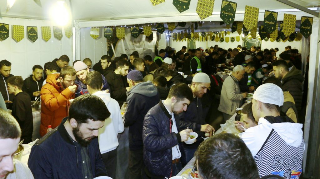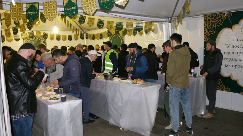 Такие ужины-разговения проводятся на средства меценатов. В 2023 году один день ифтара в специальном шатре стоит 50 тысяч рублей.