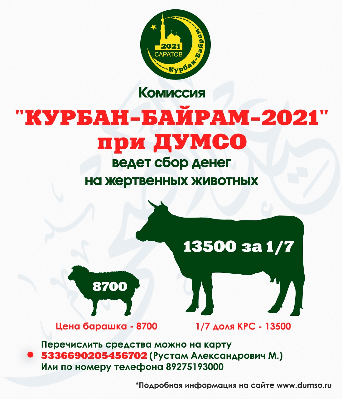 Стоимость одного барана составит 8 700 рублей, стоимость 1/7 коровы (около 40 кг) — 13 500 рублей. В эти суммы входит приобретение животного, его забой, фасовка и развозка курбана по адресам нуждающихся в дни праздника.
