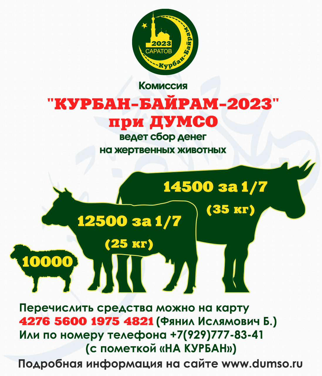Деньги можно сдавать дежурным имамам Соборной мечети г.Саратова или бухгалтеру. А также можно перечислить средства на карту 4276 5600 1975 4821 (Фянил Ислямович Б.) или по номеру телефона 8-929-777-83-41 с пометкой «НА КУРБАН».
