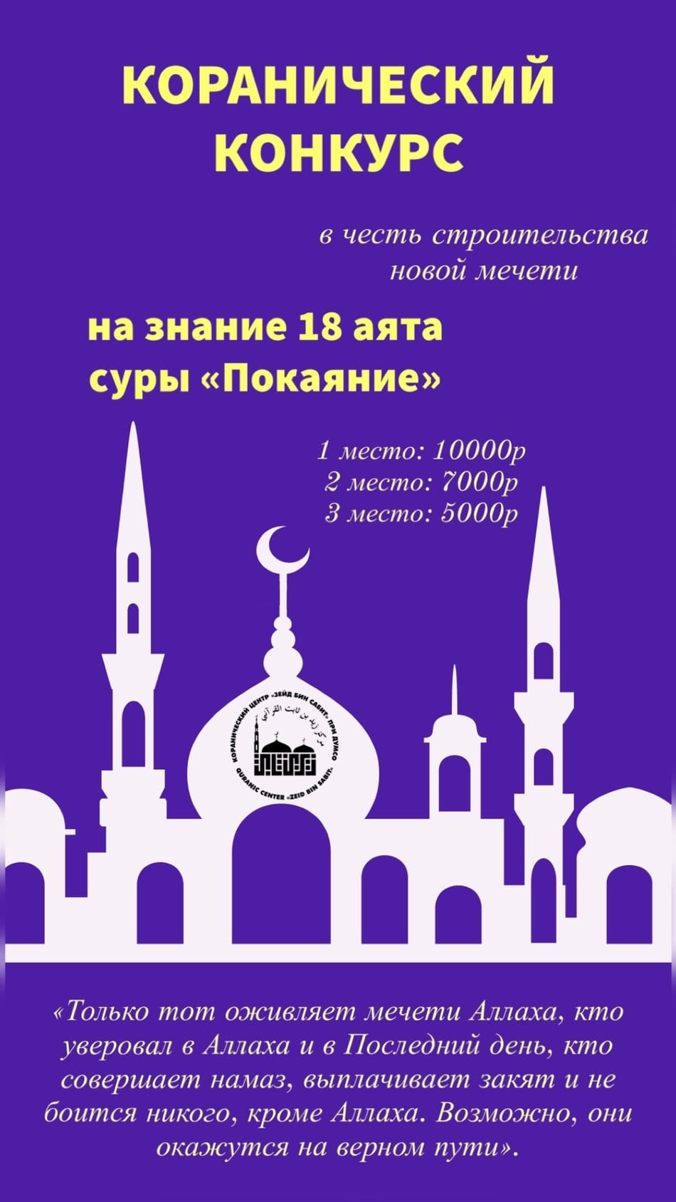 Конкурс проводится на знание 18-го аята из суры «Покаяние» среди мальчиков и девочек до 7 лет включительно (только граждане РФ).