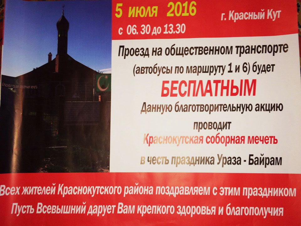 Для жителей Красного Кута был заготовлен еще один сюрприз. 5 июля мусульмане оплатили работу автобусов по двум маршрутам с 6.30 до 13.30, которые в честь великого праздника Ислама бесплатно возили горожан. Об этом также гласили специальные плакаты, которые поздравляли пассажиров с Ураза-Байрамом.