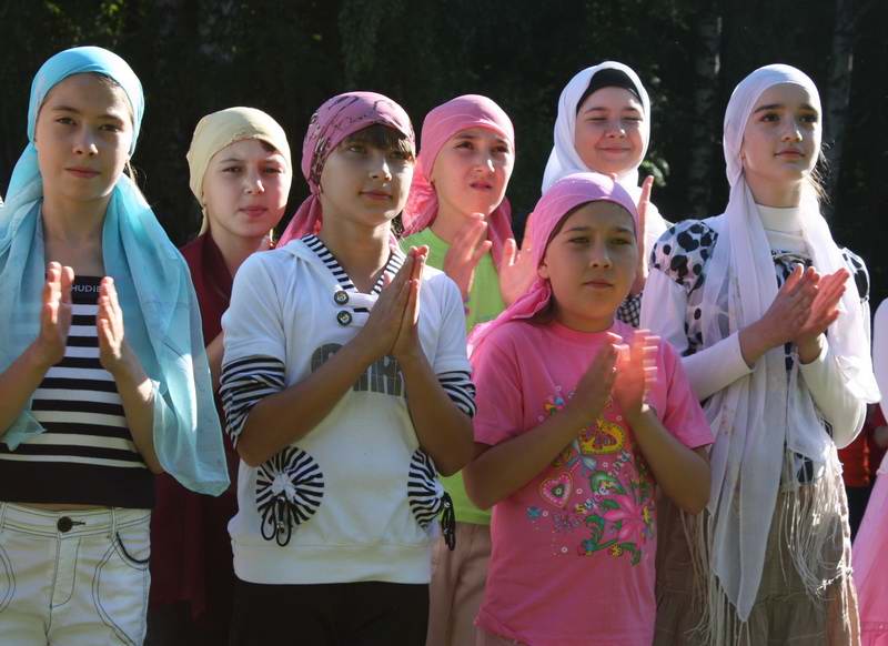 Затем дети представили на несуровый суд зрителей небольшой концерт, на котором прозвучали песни на татарском, казахском и арабском языках. Юные мусульманки декламировали стихи известных авторов и свои собственные творения, а также исполняли народные танцы.