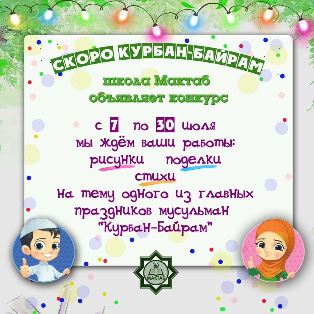 Для участия в конкурсе принимаются рисунки, поделки и стихи, посвященные главному торжеству Ислама и мусульман.