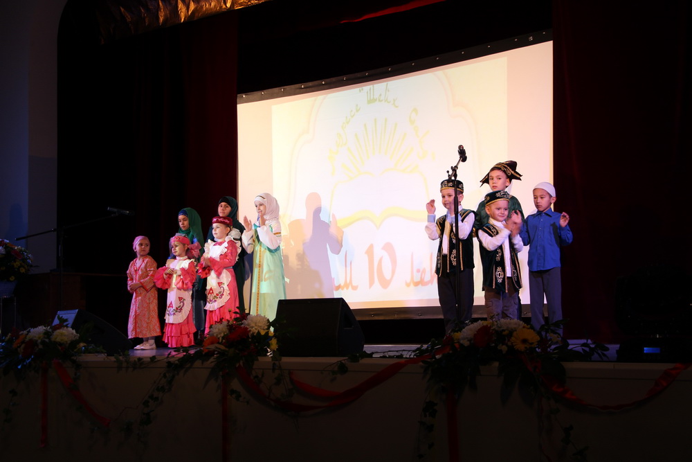 Затем на сцене выступили учащиеся воскресной школы «Мактаб» с творческим номером, были показаны видеоролики об истории медресе, его преподавателях и выпускниках, которые после окончании учебы продолжили получать знания и нашли свое призвание на ниве Ислама.