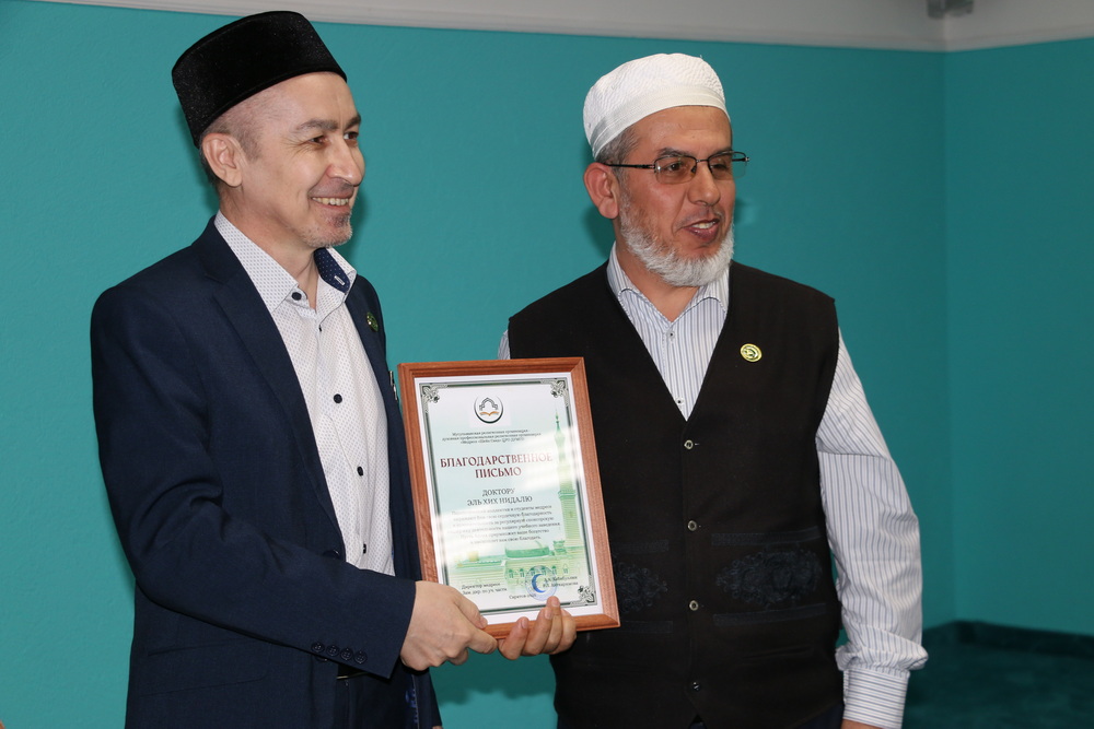 В ходе собрания не обошлось и без торжественных моментов. За помощь и содействие в работе исламского образовательного заведения были вручены благодарственные письма членам попечительского совета медресе — Салману-хаджи Мусаеву, Хамзе-хаджи Баширову, шейху Нидалю эль-Хиху — и члену совета БФ «Юмарт» Рашиду-эфенди Муляеву.