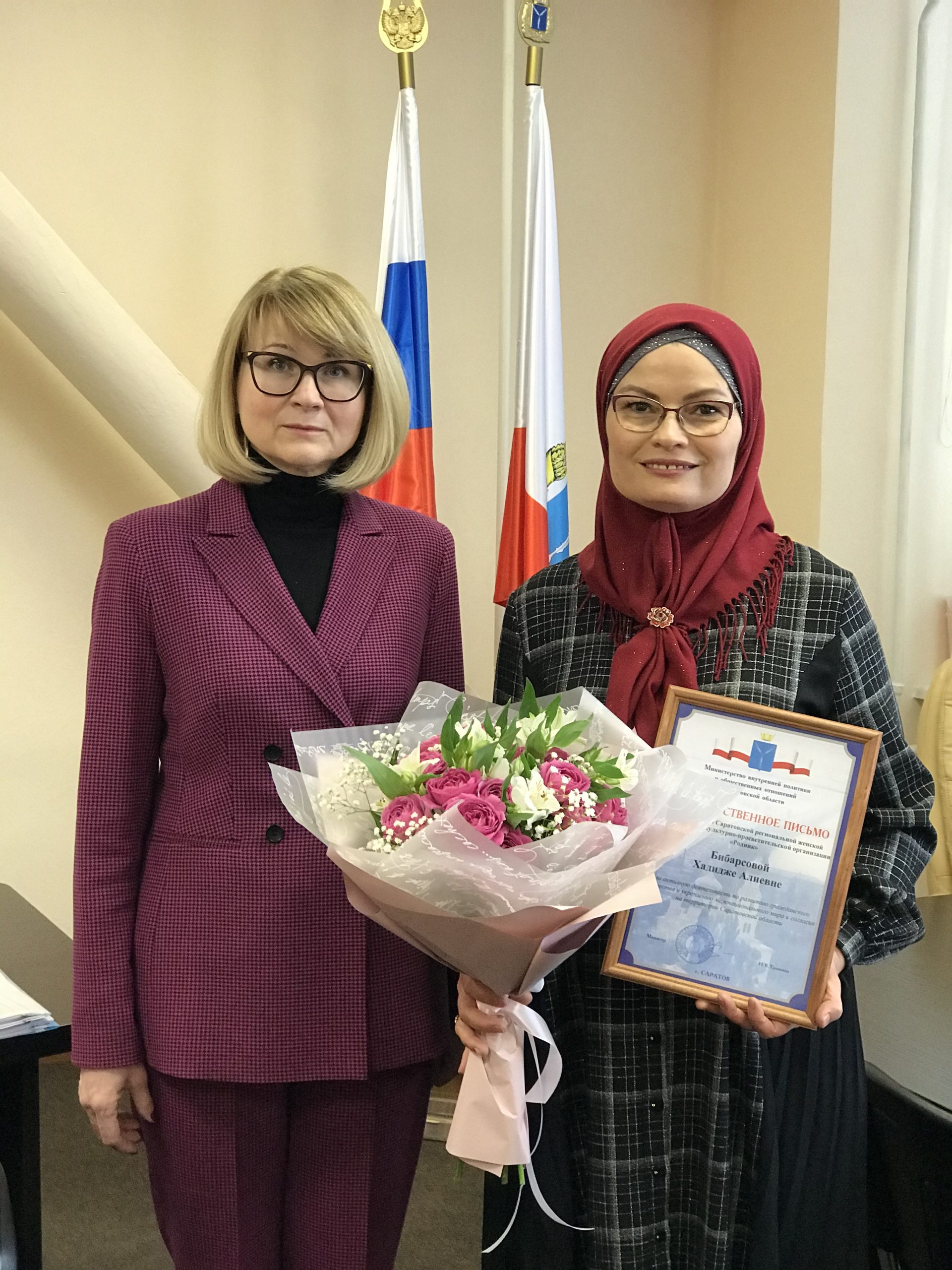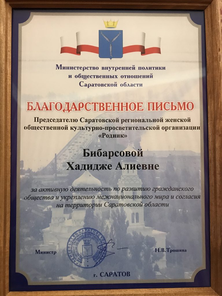 В ходе встречи министр внутренней политики и общественных отношений Саратовской области Наталья Трошина вручила благодарственное письмо руководителю женской общественной организации «Родник» Хадидже Бибарсовой за активную деятельность по развитию гражданского общества и укреплению межнационального мира и согласия на территории Саратовской области.