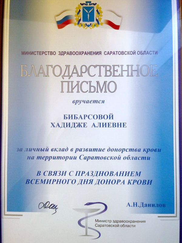 В ходе торжества руководитель «Родника», член Общественного совета министерства здравоохранения Саратовской области Хадиджа Бибарсова была награждена благодарственным письмом министра здравоохранения Алексея Данилова за личный вклад в развитие донорства в регионе. Кроме этого областной Центр крови преподнес ей памятные подарки.