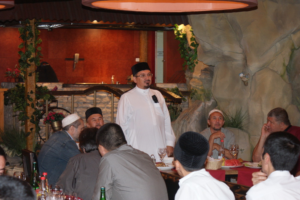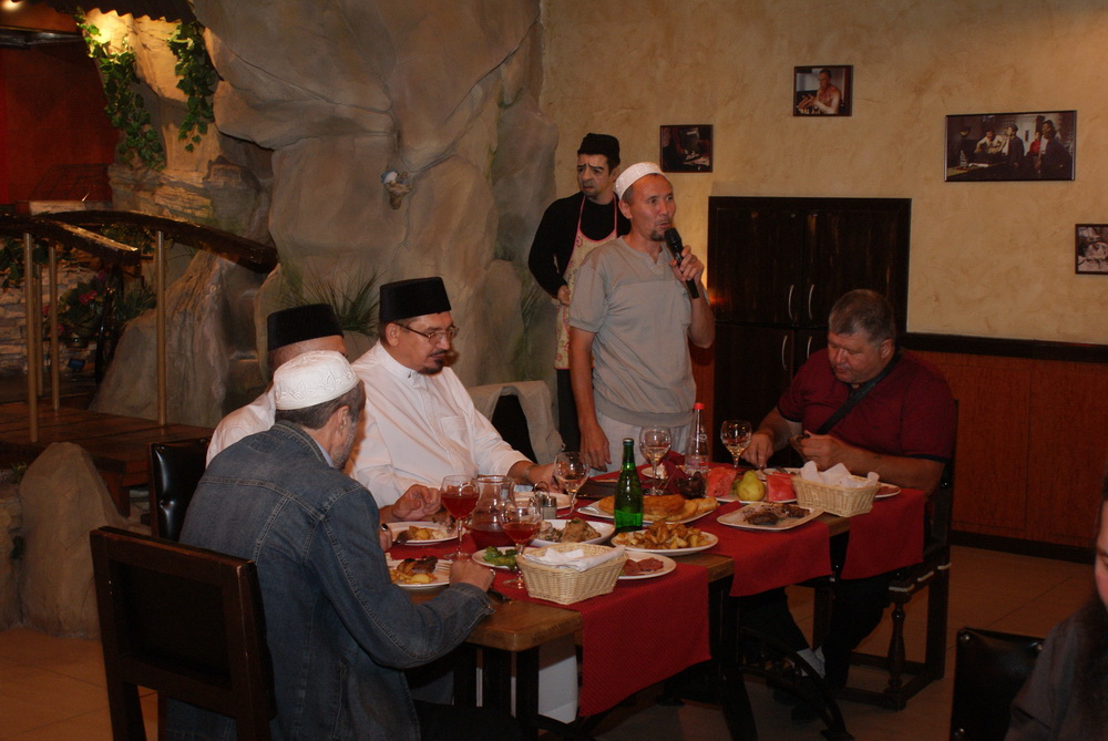 Затем, после первых звуков Азана постящиеся приступили к разговению и прочитали Магриб-намаз в одном из залов ресторана. После того, как все отведали изысканные блюда от шеф-повара заведения, слово предоставили главному наставнику саратовских мусульман – муфтию Саратовской области Мукаддас-хазрату Бибарсову.