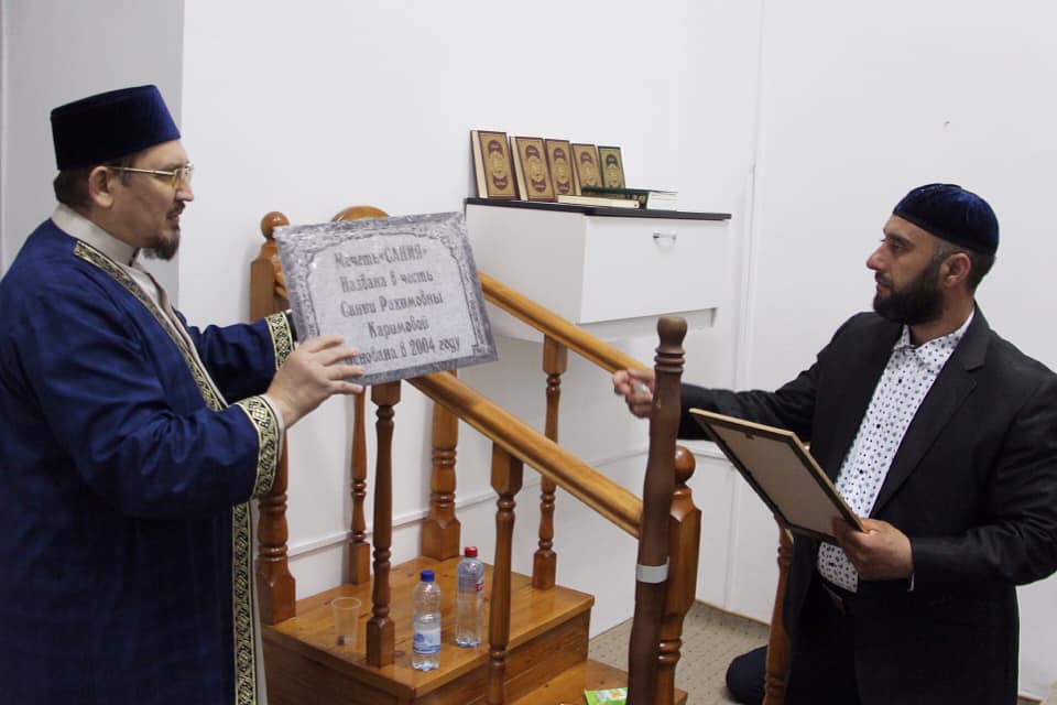 Также Мукаддас-хазрат передал имаму Махмету-хазрату Каляшеву памятную табличку – Соборная мечеть Озинок носит имя «Сания». Идея построить мечеть здесь зародилась у местных мусульман еще в конце 90-х годов. Но неоднократные попытки начать ее возведение не увенчались успехом. Лишь в 2004 году был заложен первый камень под будущую мечеть. Была достигнута договоренность, что по завершении строительства мечеть будет названа в честь Сании Рахимовны Каримовой, мамы Шавката-хаджи Каримова, инициатора и руководителя строительства Соборной мечети Озинок.