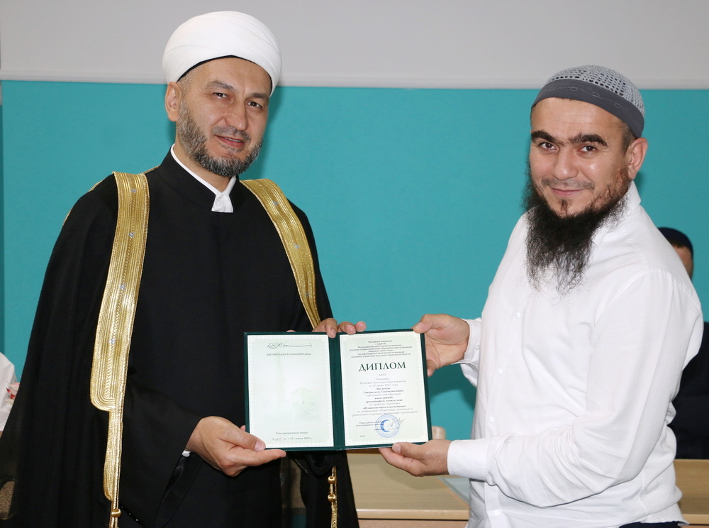 Затем муфтий Саратовской области вручил дипломы выпускникам медресе «Шейх Саид». В 2025 году их получили 9 человек. Пятеро из них обучались на вечернем отделении. Четверо выпускников учились на заочном отделении — они приезжали на занятия и сессии из Тверской, Пензенской и Саратовской областей. Каждому получившему диплом присуждена квалификация «Имам хатыйб, преподаватель основ Ислама» («Преподаватель основ Ислама» — выпускницам) по профилю подготовки «Исламские науки и воспитание» по направлению «Подготовка служителей и религиозного персонала религиозных организаций».