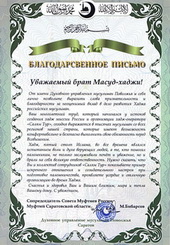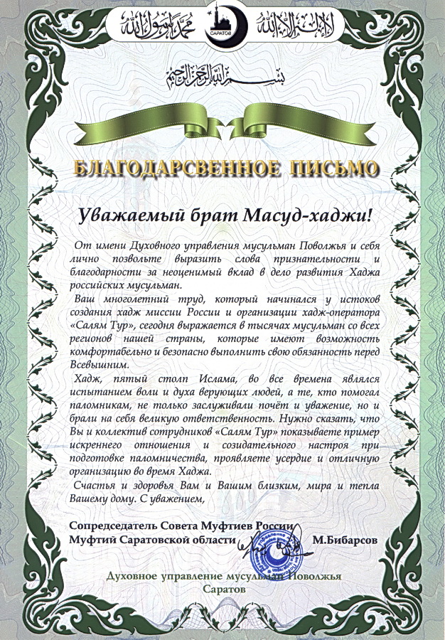 В благодарственном письме на имя руководителя этой организации Масуда-хаджи Хаснаои муфтий выразил слова признательности за созидательную деятельность «Салям Тур», искреннее отношение и усердие в деле развития российского Хаджа.