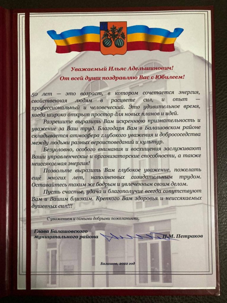Мероприятие также посетил глава Балашовского района Павел Петраков. Он поздравил всех мусульман с месяцем Поста. Он также вручил благодарственное письмо и смысловой перевод Корана имаму-мухтасибу Балашовского района Ильясу-хазрату Юнкину по случаю его юбилея.От имени муфтия Саратовской области Мукаддаса-хазрата Бибарсова приветственный адрес зачитал его заместитель Ильяс-хаджи Богатырев.