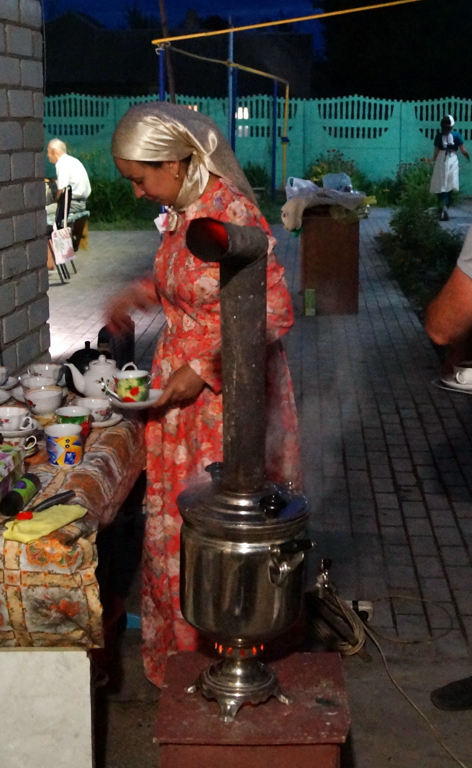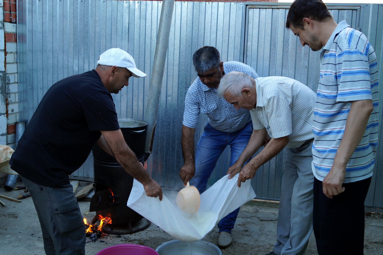 Ифтар прошел во дворе мечети. Здесь для постящихся готовился бухарский плов, а также стояли самовары на дровах и шишках.