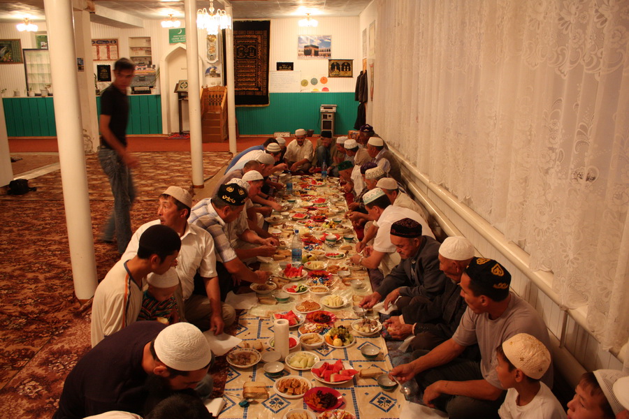 Кругом бегали и играли маленькие дети, девушки и женщины в красивых нарядах, суета организаторов мероприятия и их помощников — всё это в тот вечер наполняло залы мечети красками радости и праздности. Заняв свои места за торжественным столом, все оживленно беседовали друг с другом, в ожидании вкушения аппетитных блюд. Шурпа из баранины и таджикский плов стали вкусным угощением для приглашенных. Общение за столом также сопровождалось беспрерывным чаепитием, для которого женщины специально испекли вкусный румяный яблочный пирог.