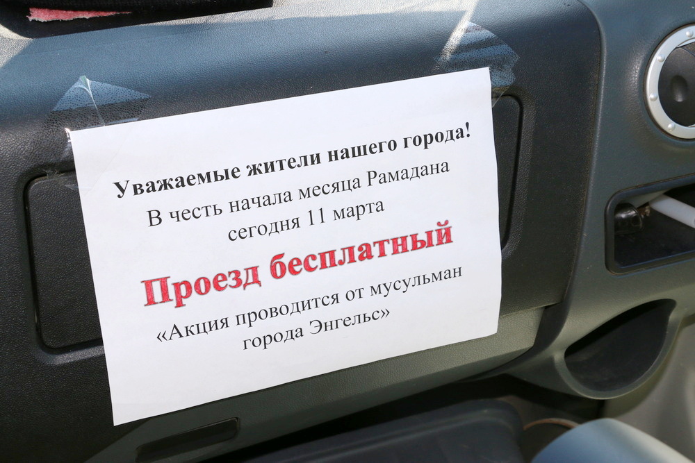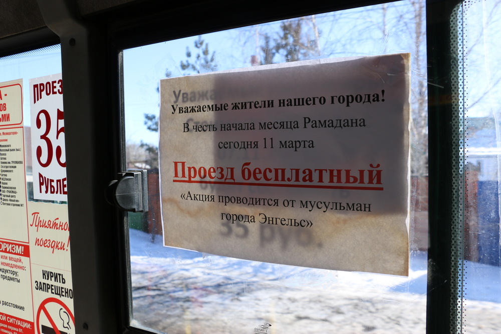 Целый день водители двух автобусов информировали пассажиров, что сегодня не нужно платить за проезд. Жители и гости Энгельса поблагодарили мусульман города за такой подарок и поздравили их с наступившим Священным Рамаданом.