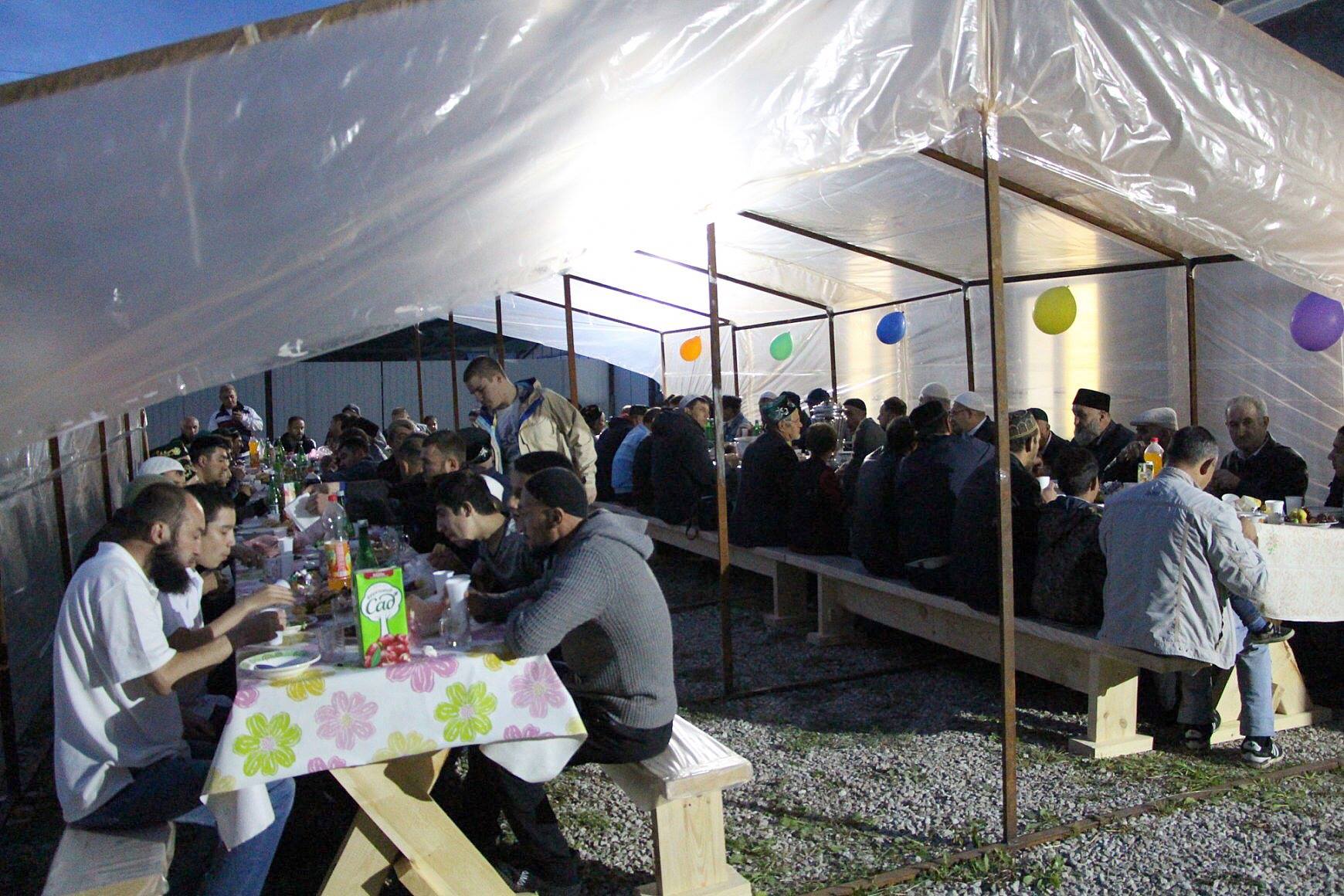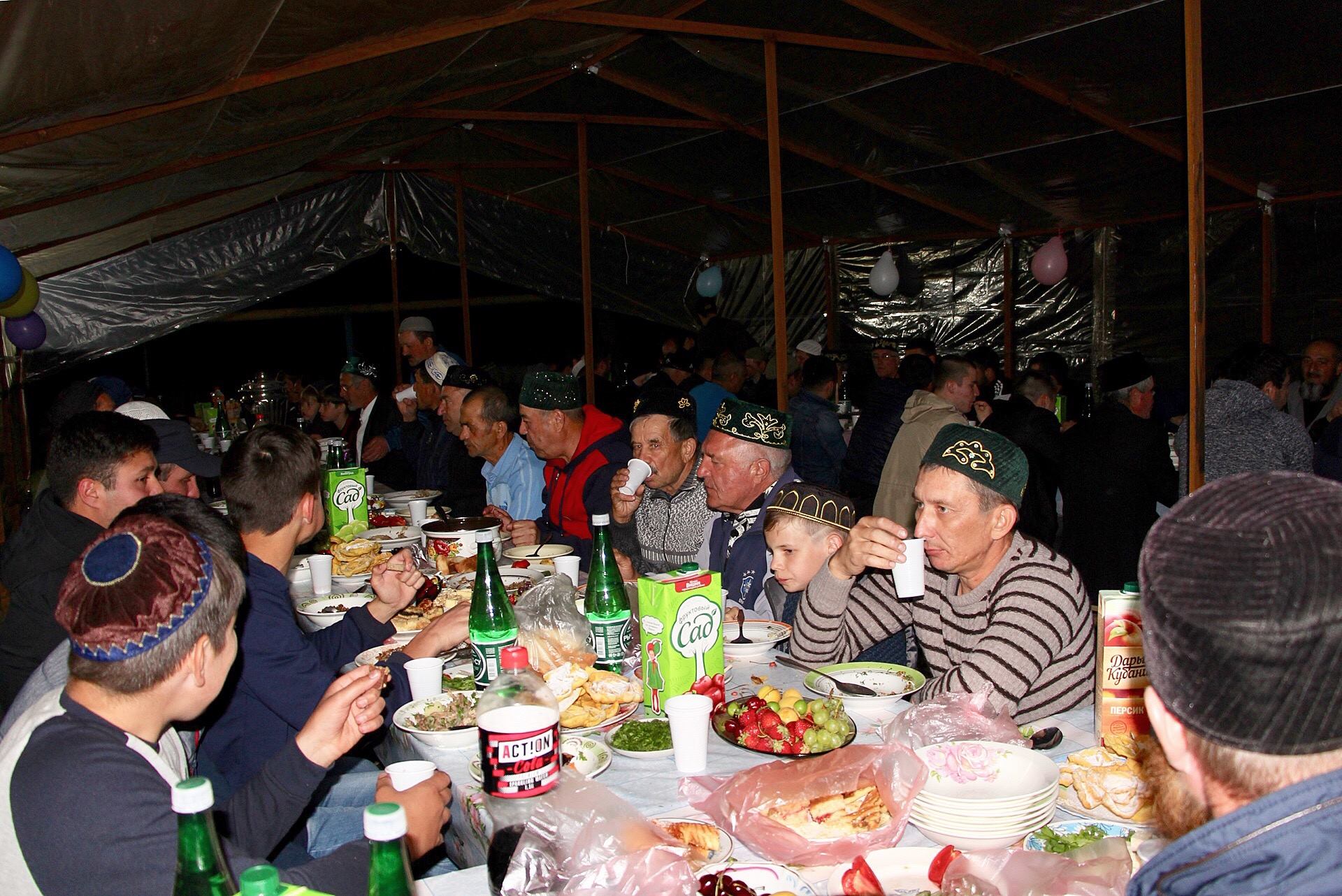 После совершения коллективного Магриб-намаза все направились во двор мечети. где в специально установленном шатре их ждали праздничные угощения.