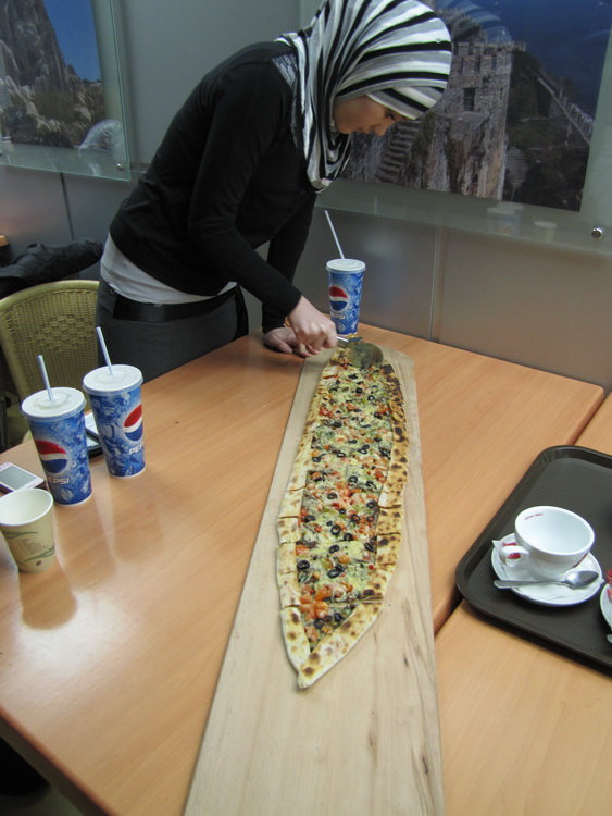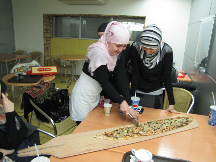 Больше же всего присутствующих удивил сюрприз от кафе «Турецкий тандыр»: специально к визиту мусульманок было приготовлено турецкое блюдо «яз пиде» (что-то наподобие пиццы в форме лодочки) в полтора метра длиной!